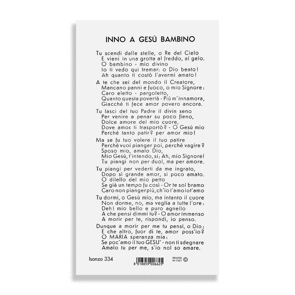 In confezione da 100 immaginette con immagine e Inno a Gesù Bambino.