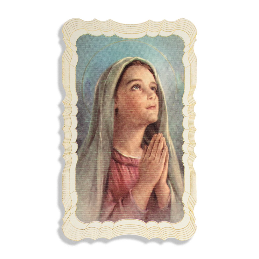 Immagine di Maria che prega stampata su cartoncino con bordi sagomati e in rilievo, decorata con dettagli in oro a caldo. Il retro è bianco per scriverci un messaggio personalizzato.