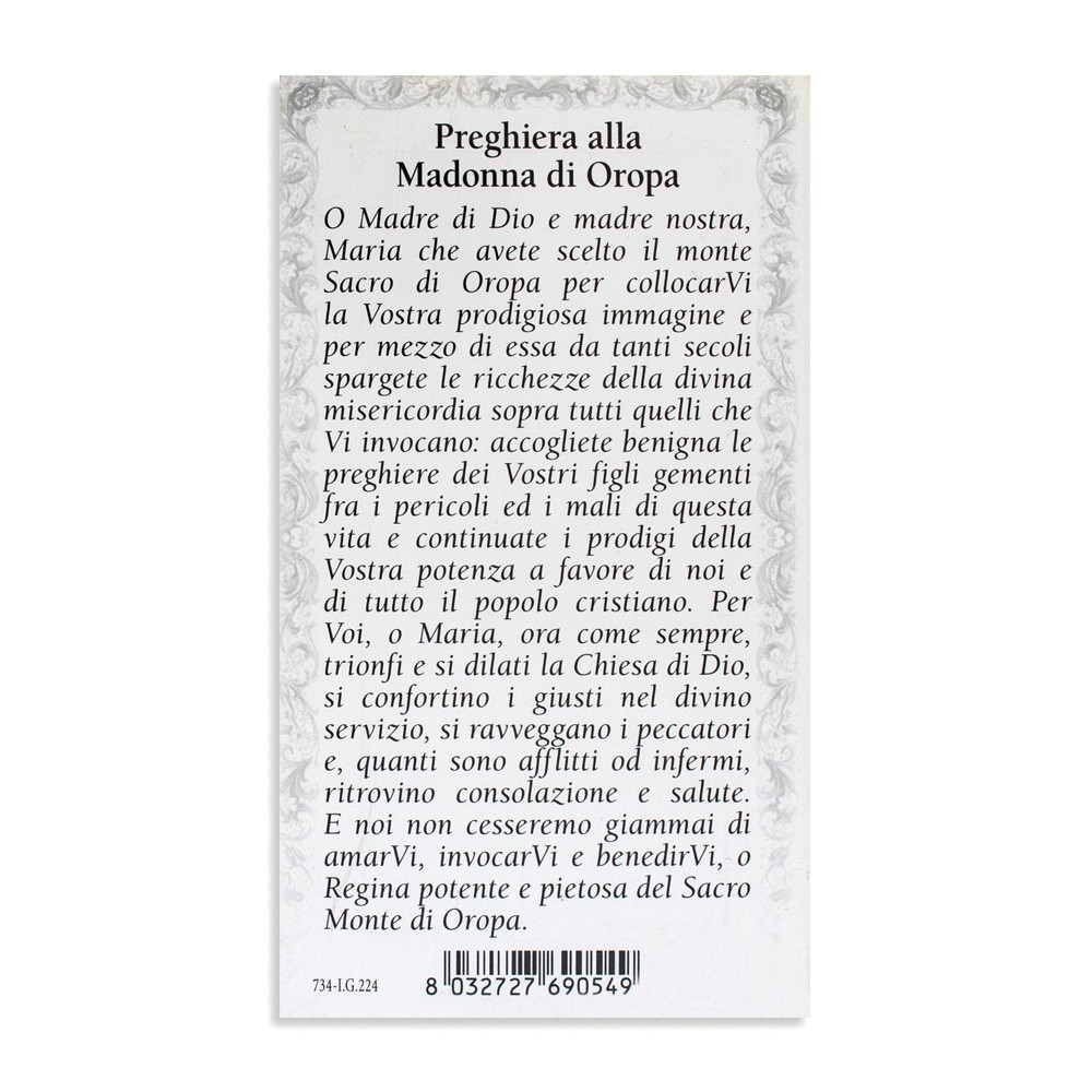 Immaginetta sacra con preghiera alla Madonna di Oropa, in confezione da 100 santini.