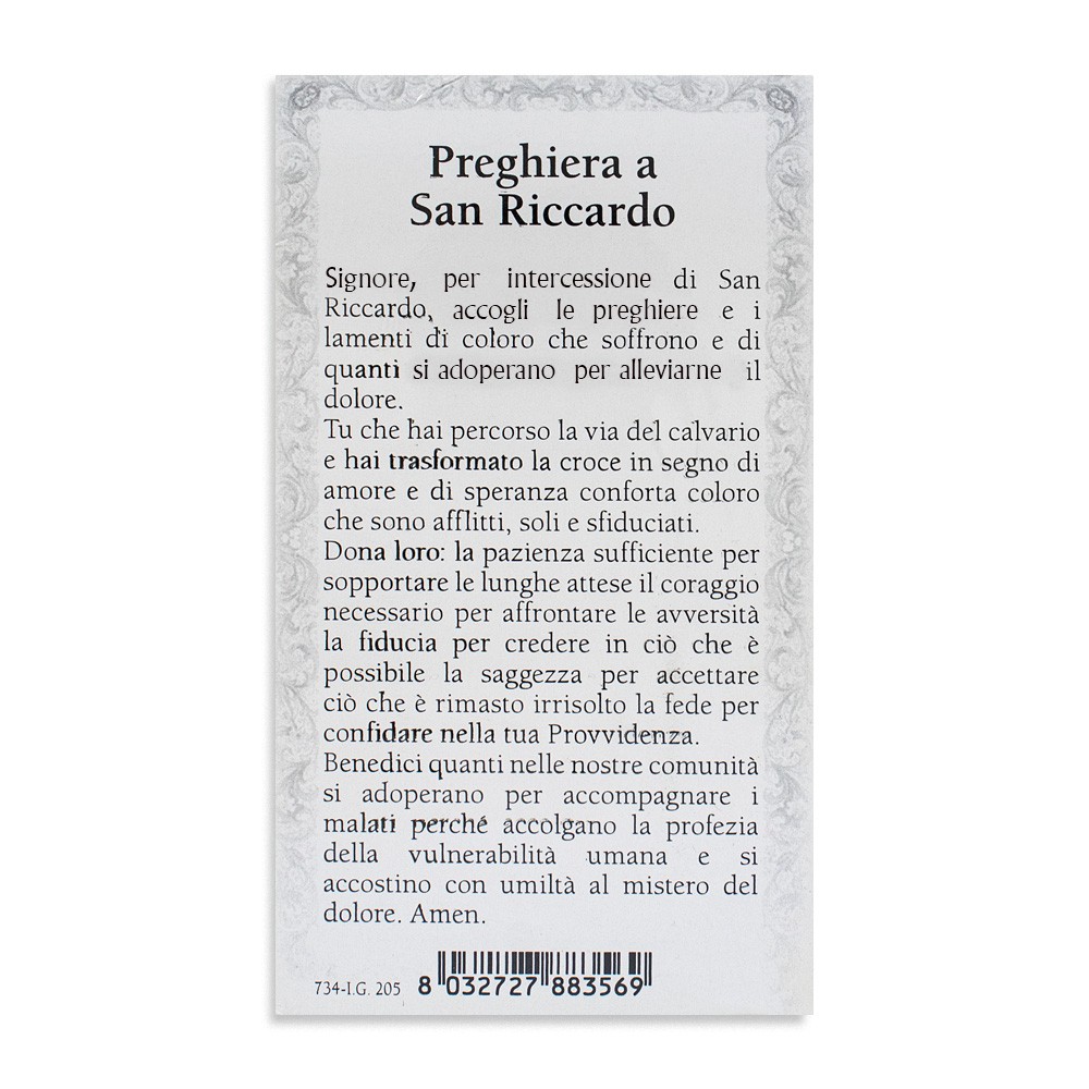 Immaginette religiose di San Riccardo con cornice e dettagli in oro a caldo. Confezione 100 santini.