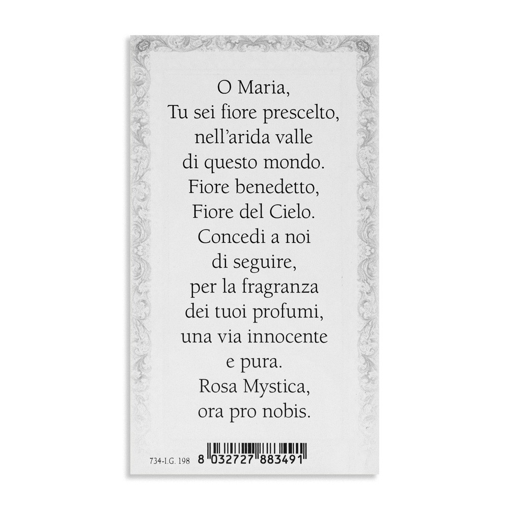 Immaginette di Maria Rosa Mistica arricchite con cornice e finiture in oro a caldo.