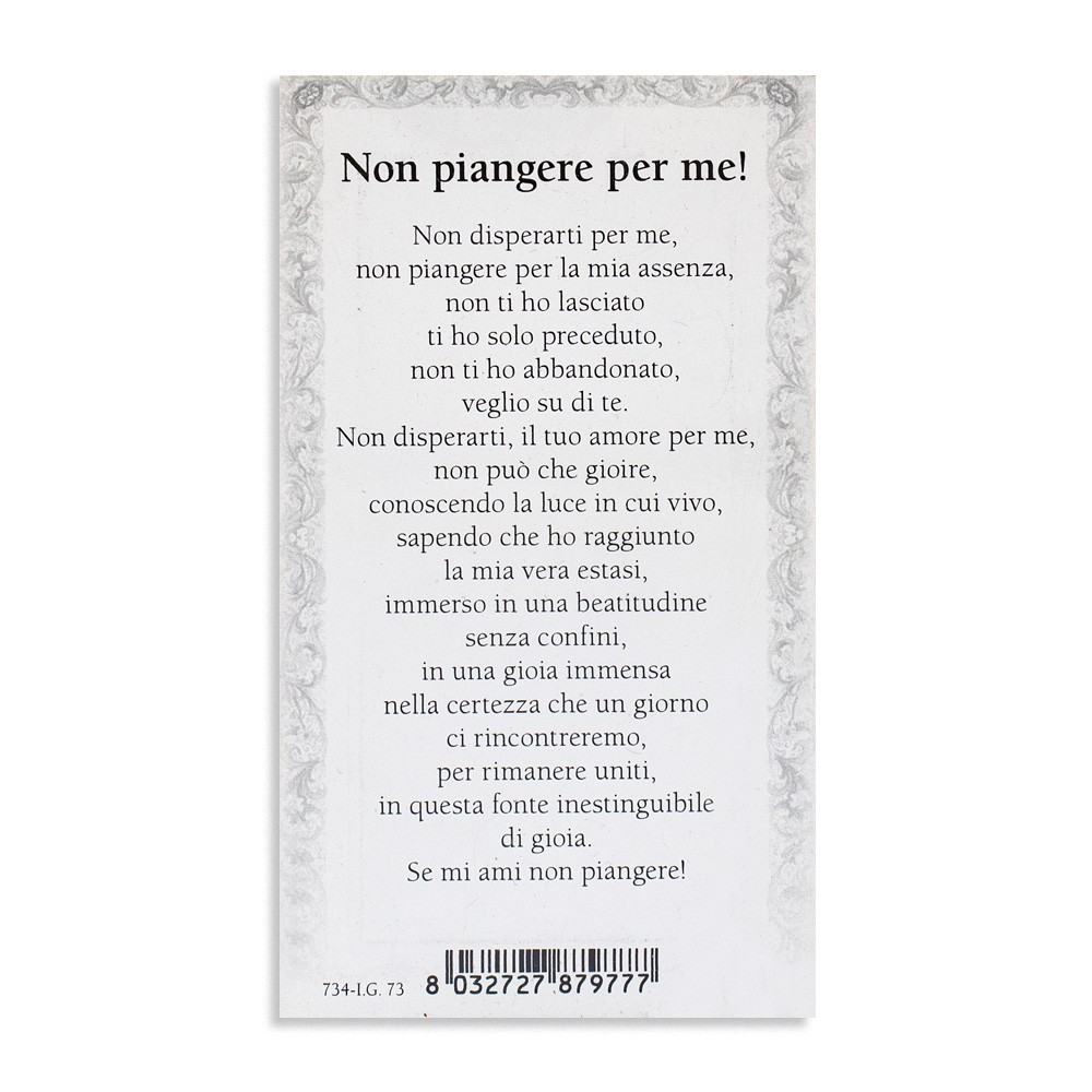 Sul retro vi è stampata la preghiera "Non piangere per me!"