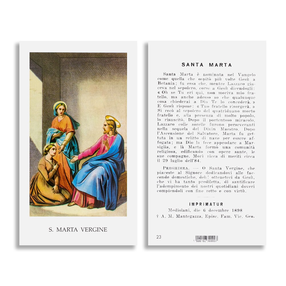 Santino con immagine e preghiera rivolta a Santa Marta Vergine, vendibile in confezione da 100 pezzi.