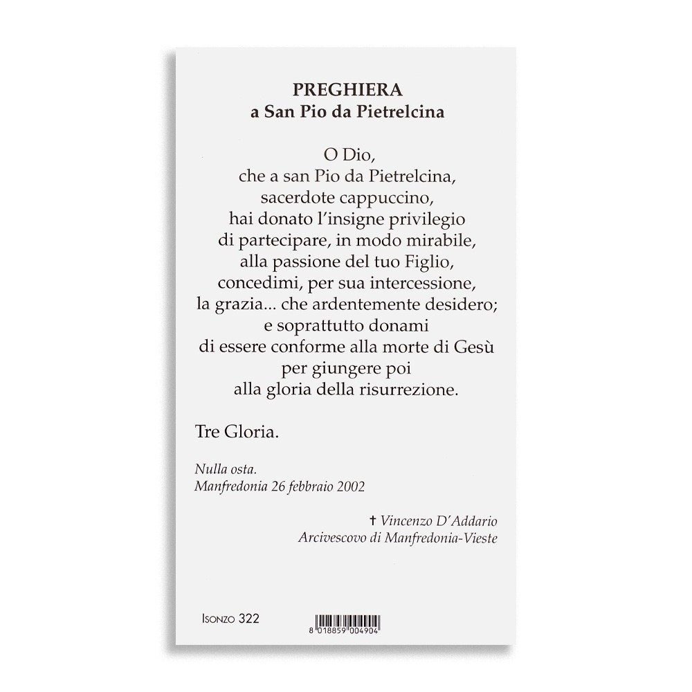 Santino con preghiera e immagine rivolta a San Pio da Pietrelcina.