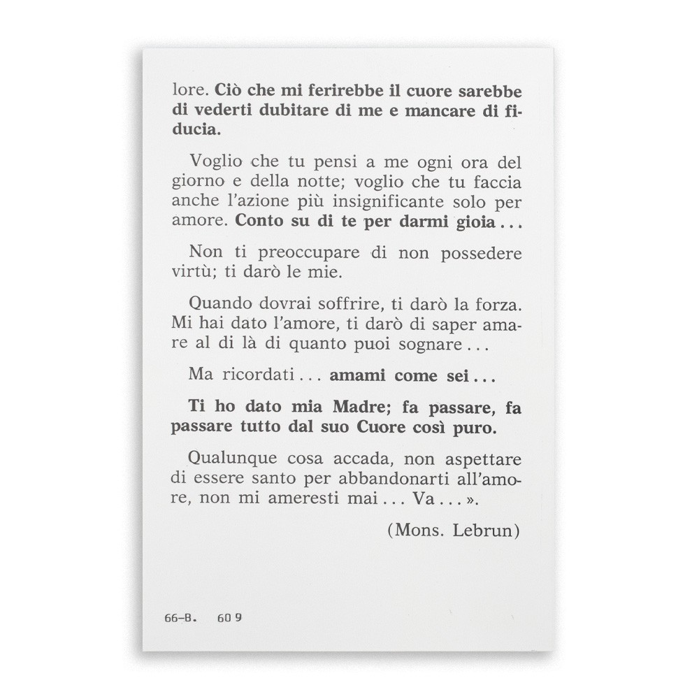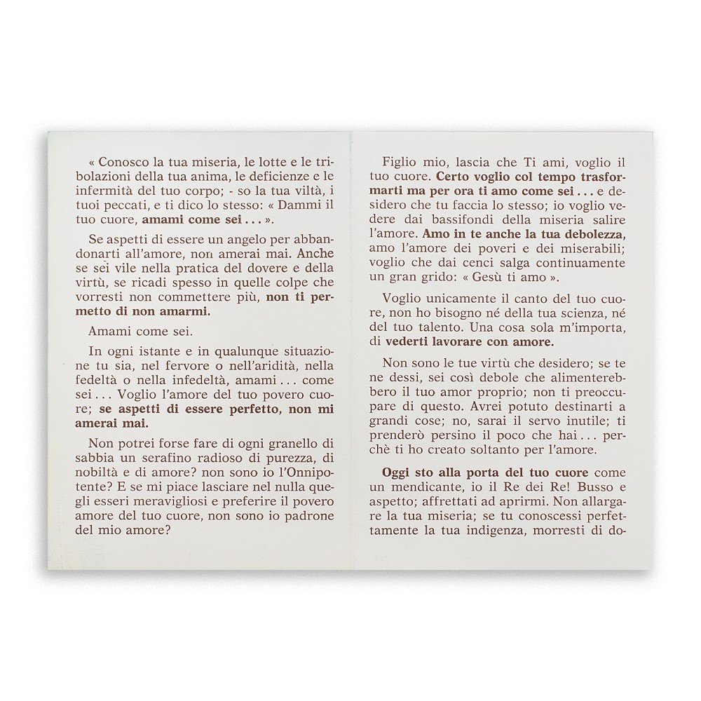 All'interno del cartoncino vi è stampato il testo Amami come sei. Gesù parla a un'anima.