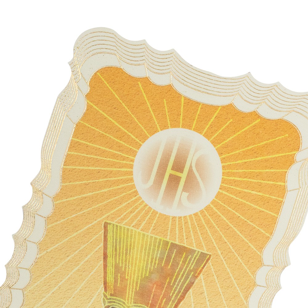 Santino della Prima Comunione con immagine raffigurata del calice e simbolo JHS con raggi.