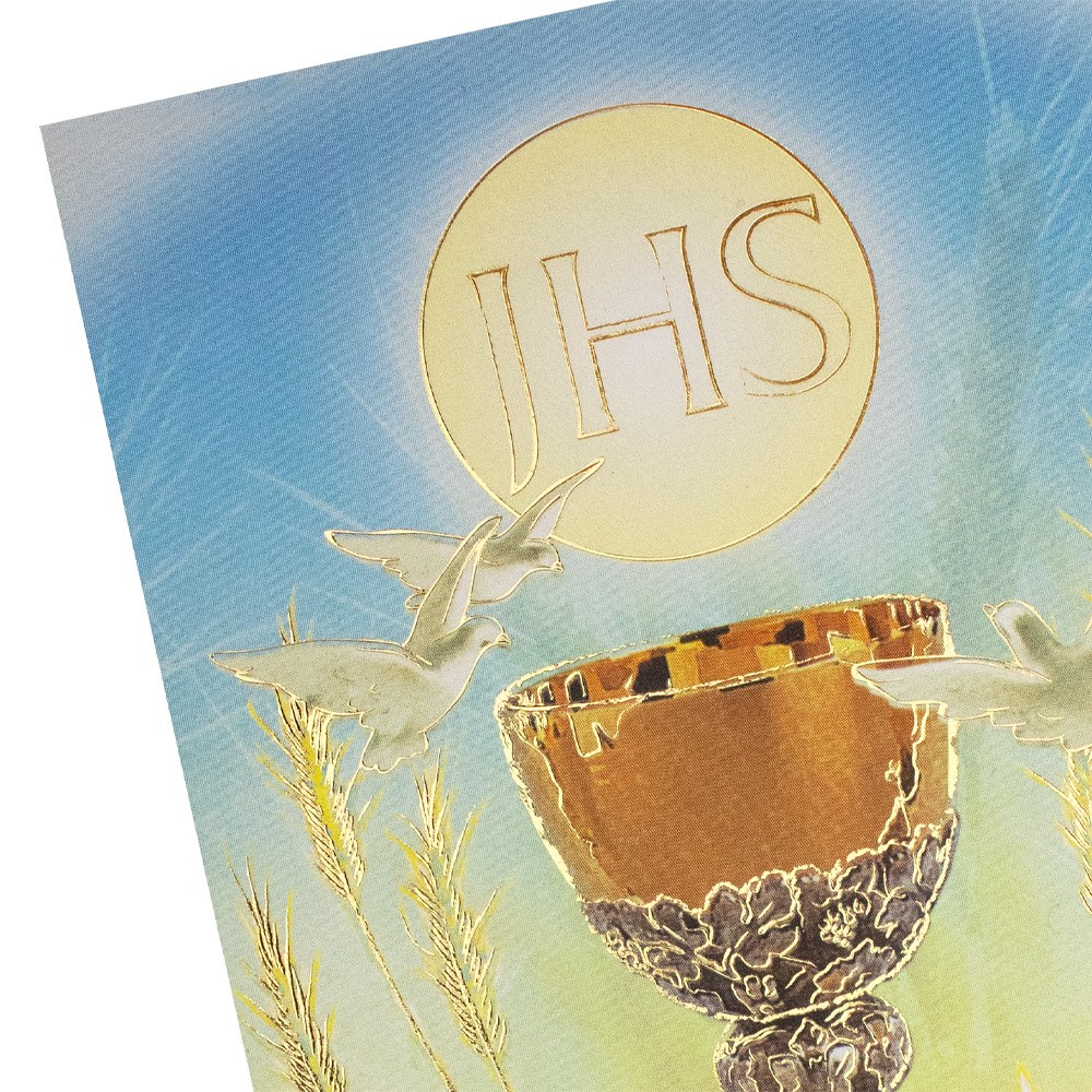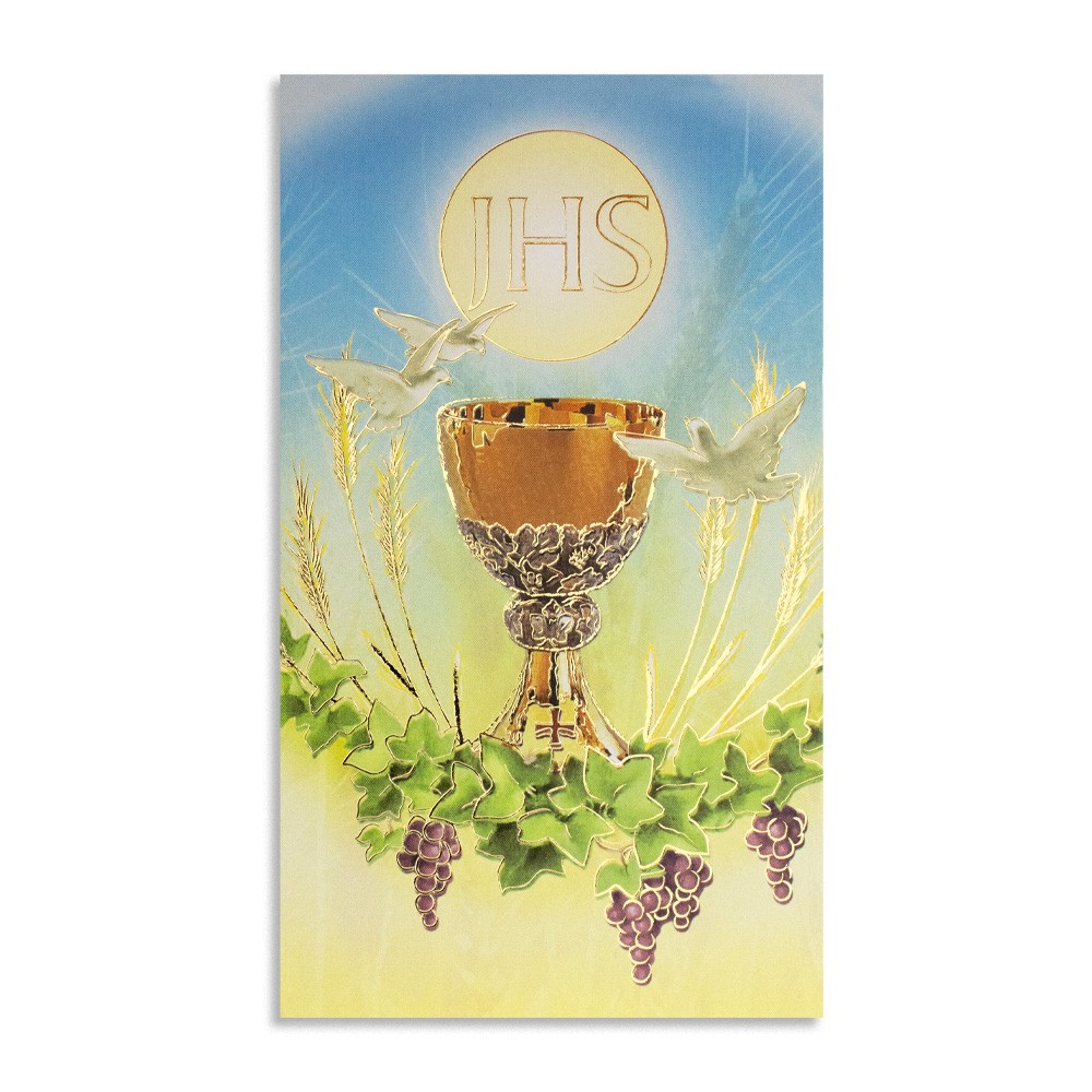 Santino della Prima Comunione con immagine sul fronte del calice centrale, grappoli d'uva e scritta JHS. Il retro è bianco per poter scrivere e personalizzare il bigliettino.