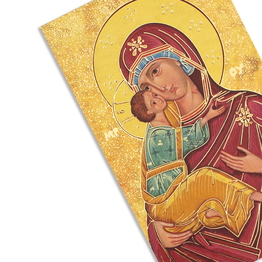 Il santino è realizzato su cartoncino ad alto spessore con dettagli in oro a caldo, raffigurando in stile contemporaneo l'icona della Madonna della Tenerezza. Il retro è bianco per poterlo anche personalizzare.