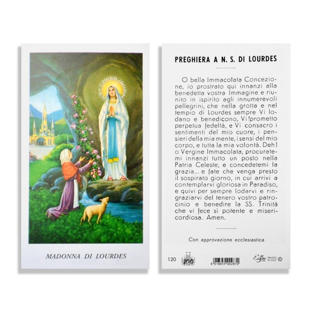Questo santino e' corredato di preghiera sul retro rivolta a N.S. di Lourdes. Misure santino: H 10,5 cm L 6 cm.