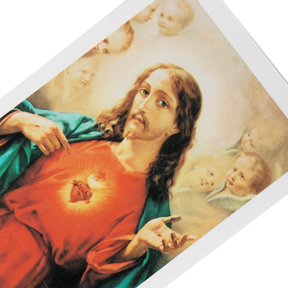 Confezione da 100 Santini con immagine del Sacro Cuore di Gesù con preghiera sul retro. Misure 10,5 x 6 cm.