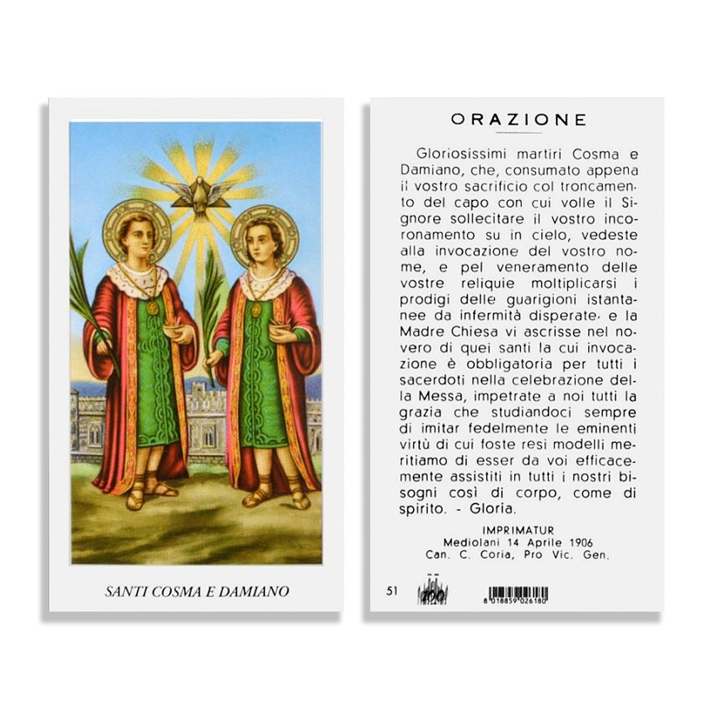Santino S. Cosma e Damiano con preghiera sul retro. Misure 10,5 x 6 cm.