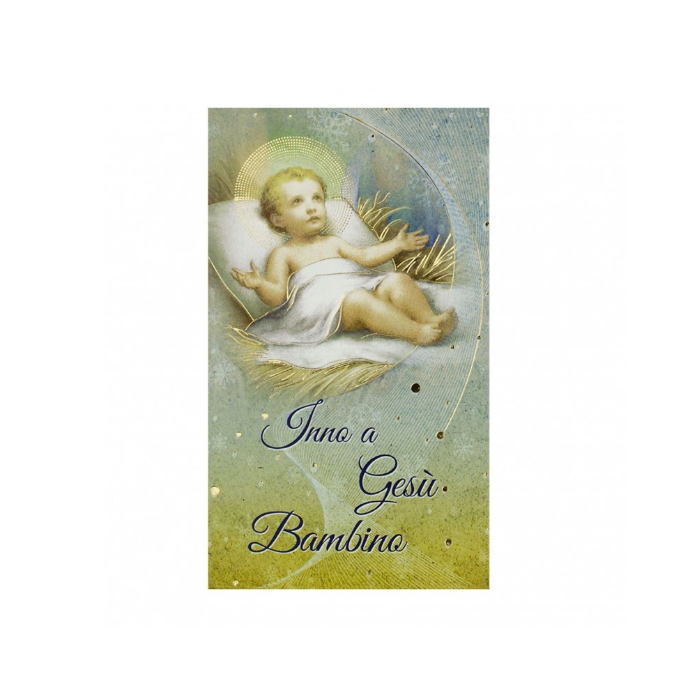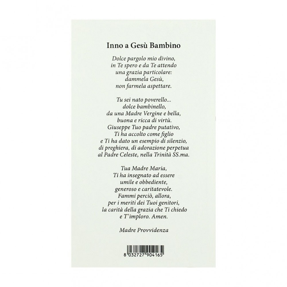 L'immaginetta è stampata su cartoncino con fondo azzurro. Sul retro è stampato l'Inno a Gesù bambino. La confezione comprende 100 immaginette formato 12 x 7 cm.