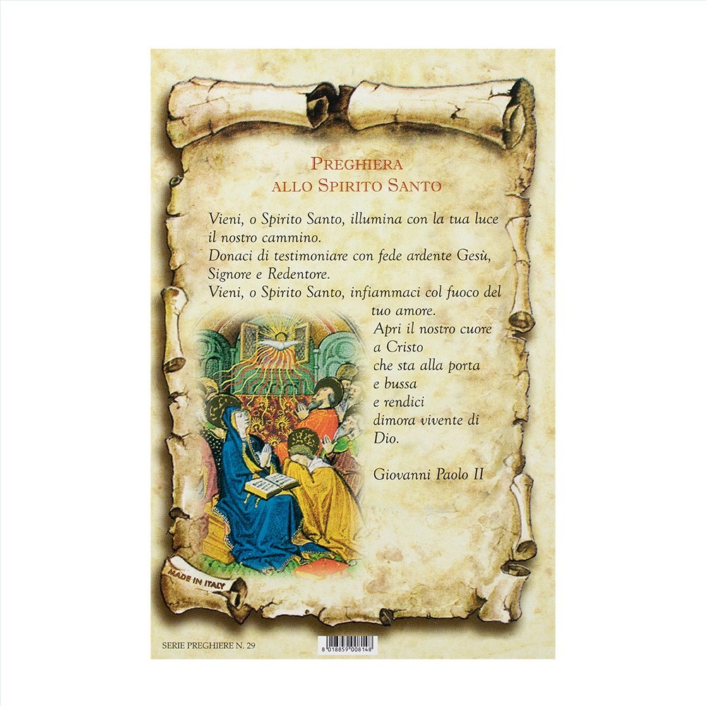 Cartoncino con preghiera allo Spirito Santo. Il cartoncino è rettangolare (formato 15,5x10 cm) a forma di pergamena. Ogni confezione comprende 100 cartoncini con preghiera.