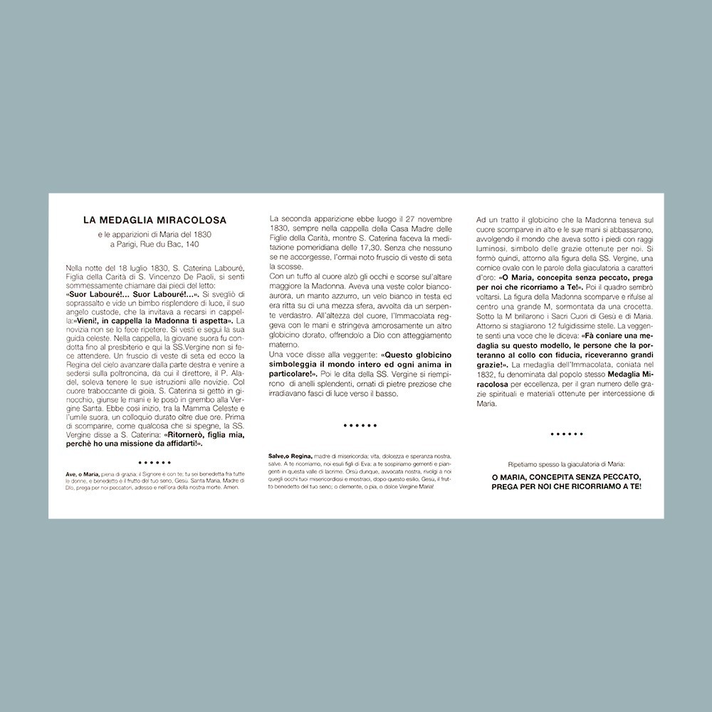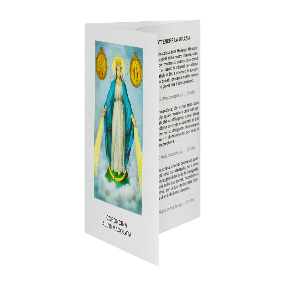 Pagellina pieghevole a tre pagine con preghiera " Coroncina e Novena all'Immacolata ". La confezione è completa di 100 immaginette.