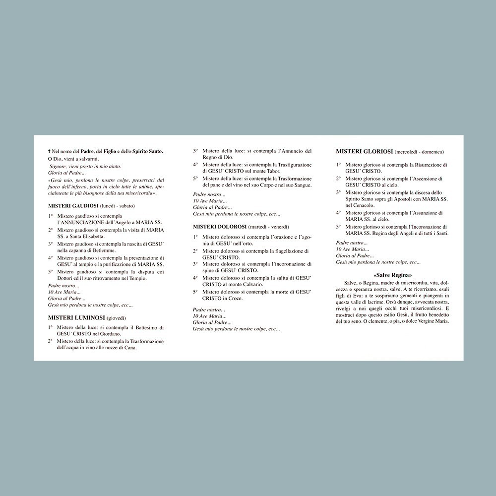 Pieghevole in carta semplice a tre fogli " Il Santo Rosario ". La confezione è completa di 100 immaginette.