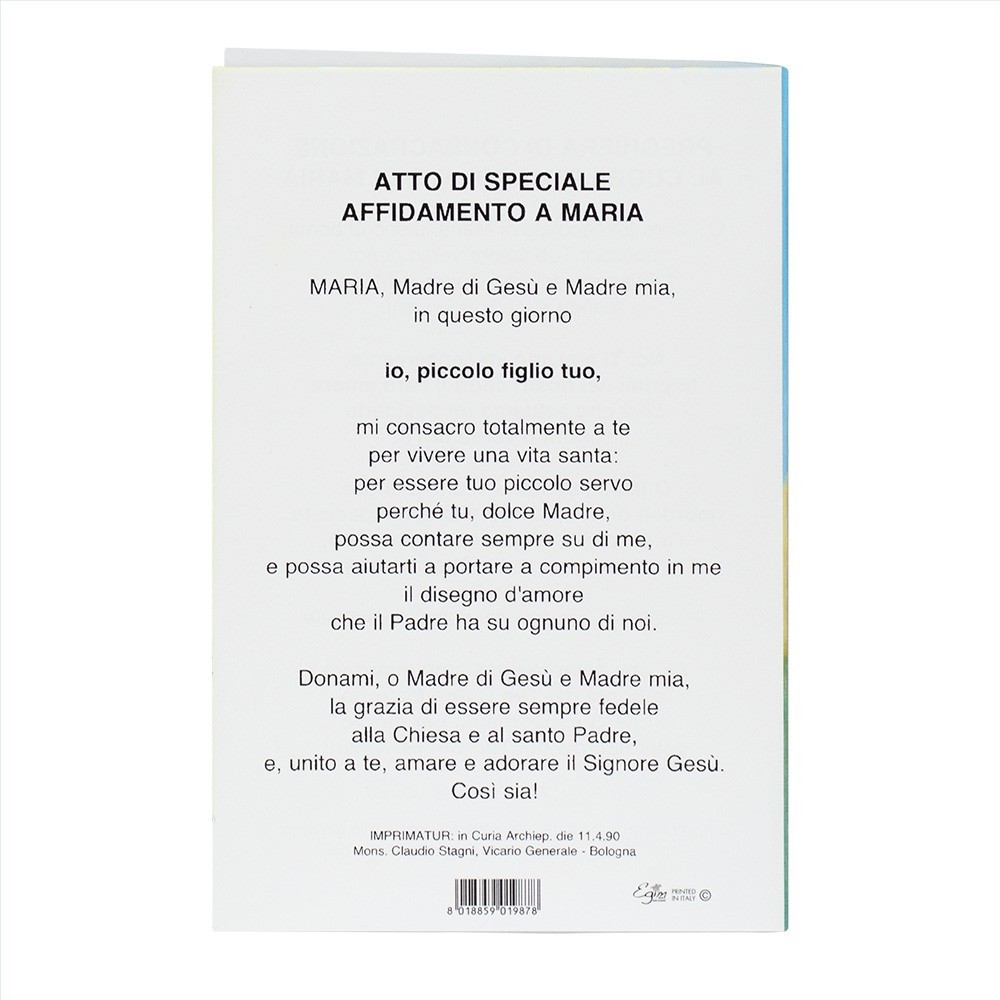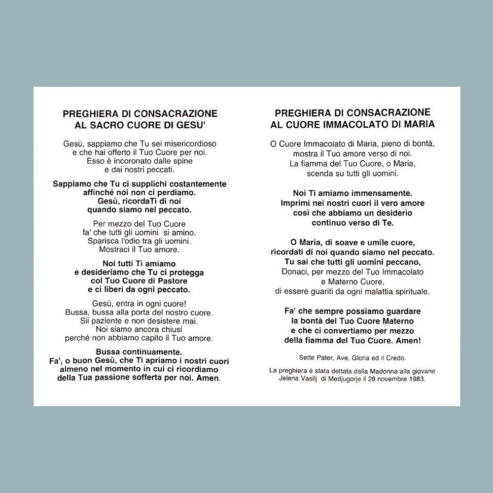 Pagellina pieghevole con preghiera di affidamento a Maria. Completa di preghiera di consacrazione al Sacro Cuore di Gesù e al Cuore Immacolato di Maria. La confezione è completa di 100 immaginette.