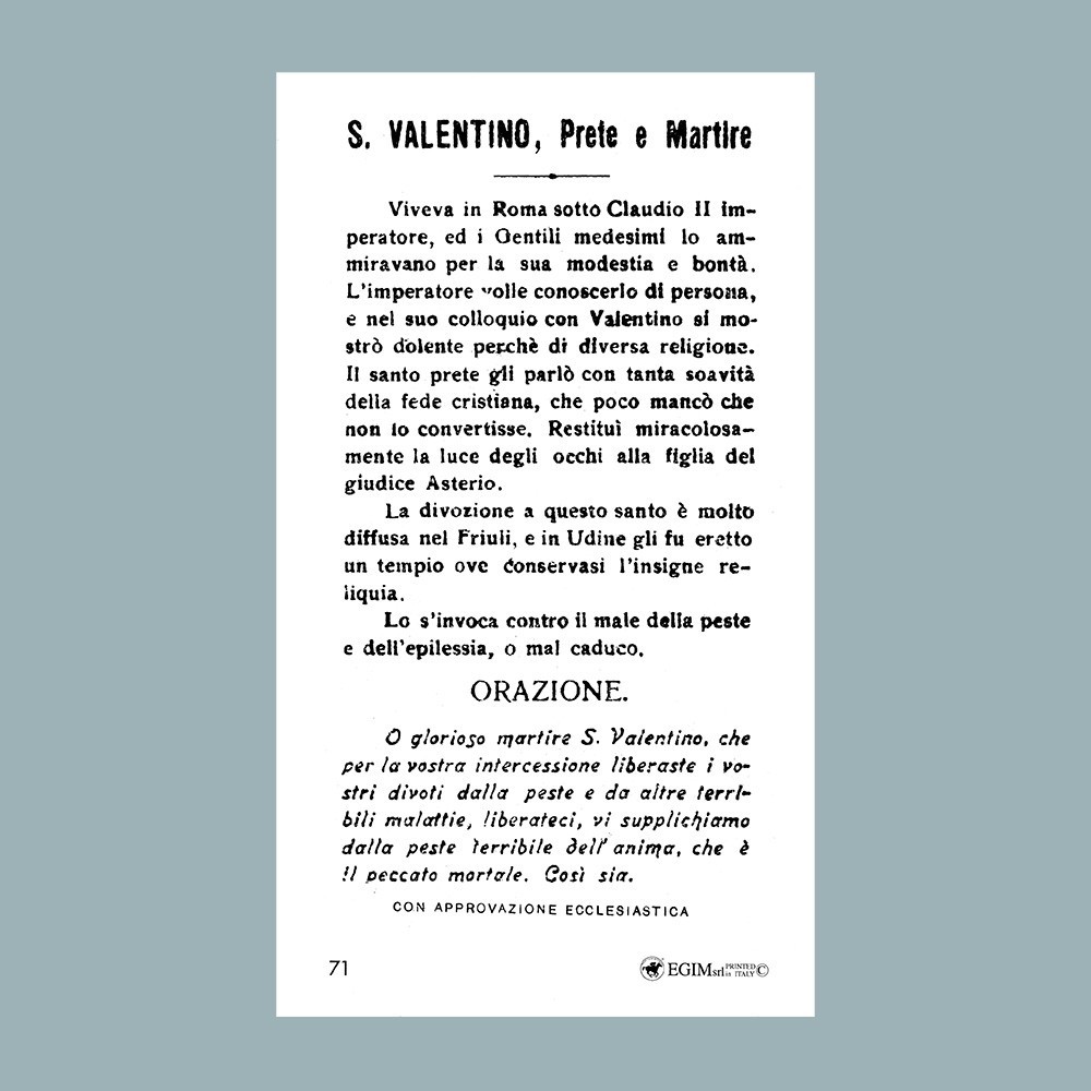Immagine sacra di San Valentino completa di preghiera. Confezione da 100 santini.
