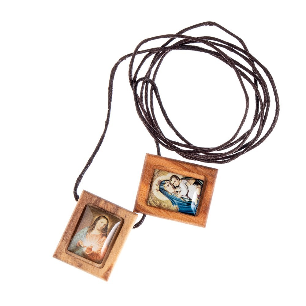 Piccolo Scapolare realizzato in legno con cordino marrone, con immagine da un lato del Sacro Cuore di Gesù e dall'altro La madonna del Carmelo.