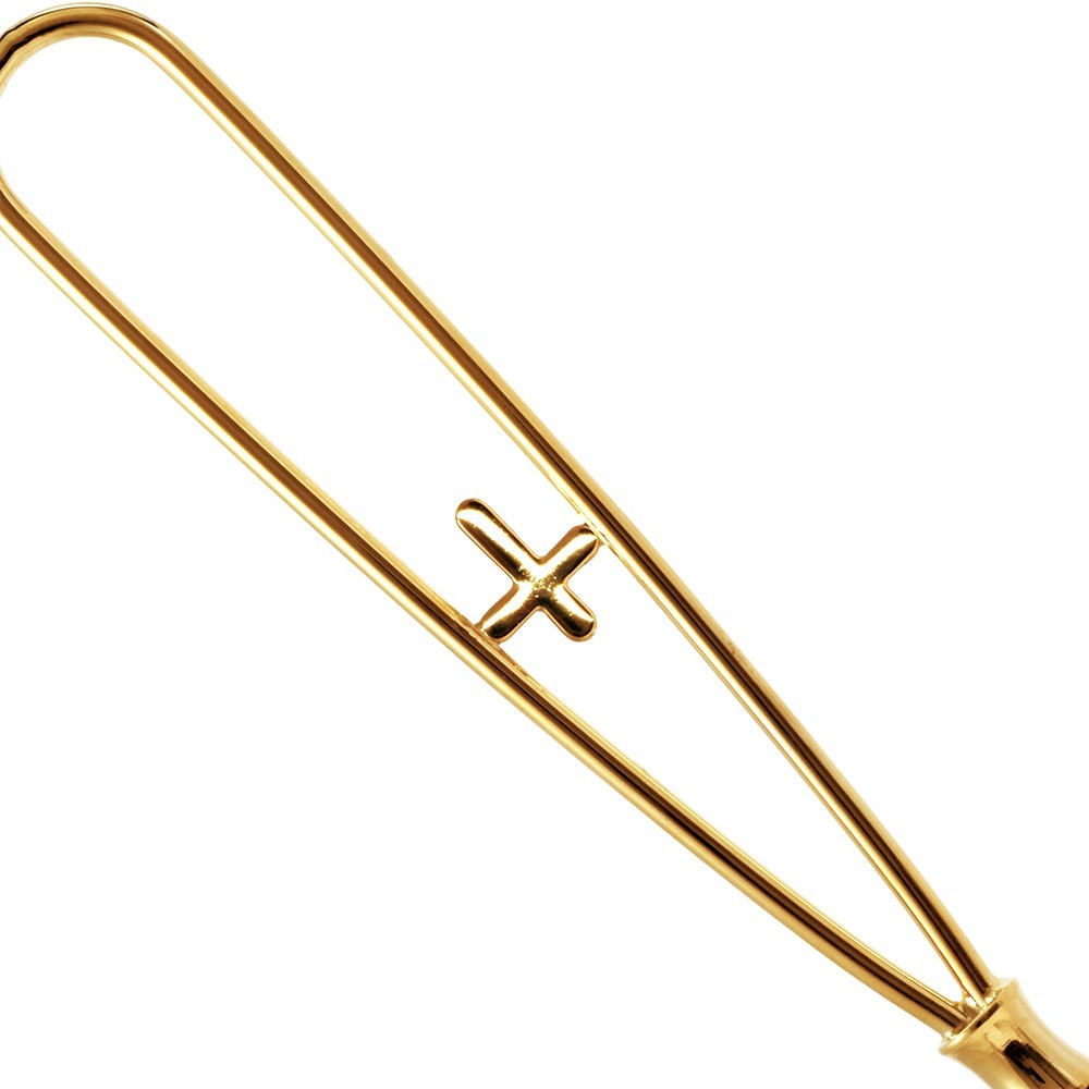 Questo arredo liturgico è realizzato in ottone in stile moderno con placca raffigurante una croce.