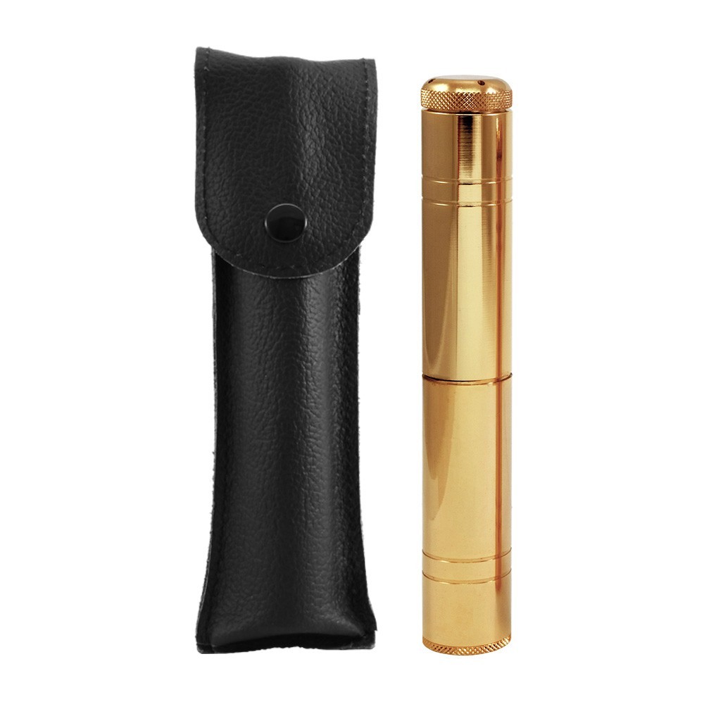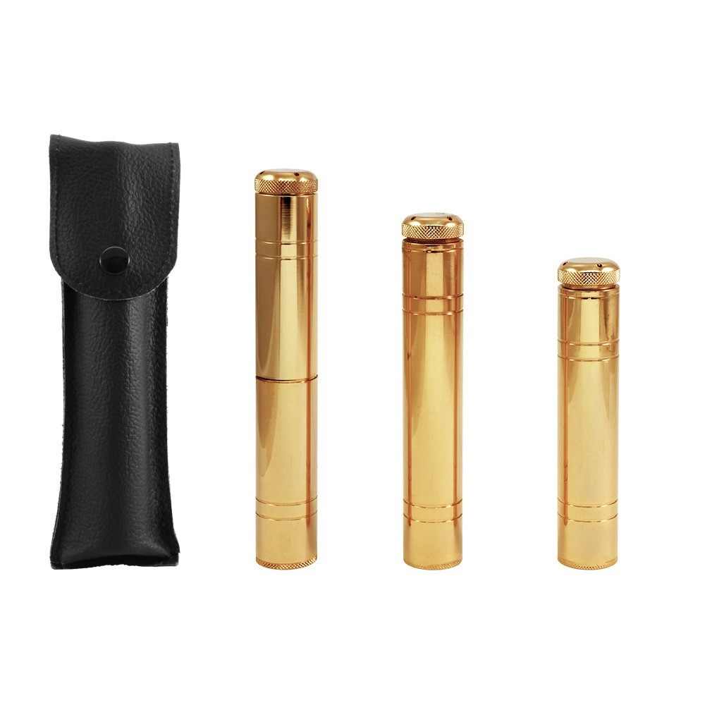 L'astuccio è realizzato in vera pelle, mentre l'aspersorio è in ottone con tonalità dorata.