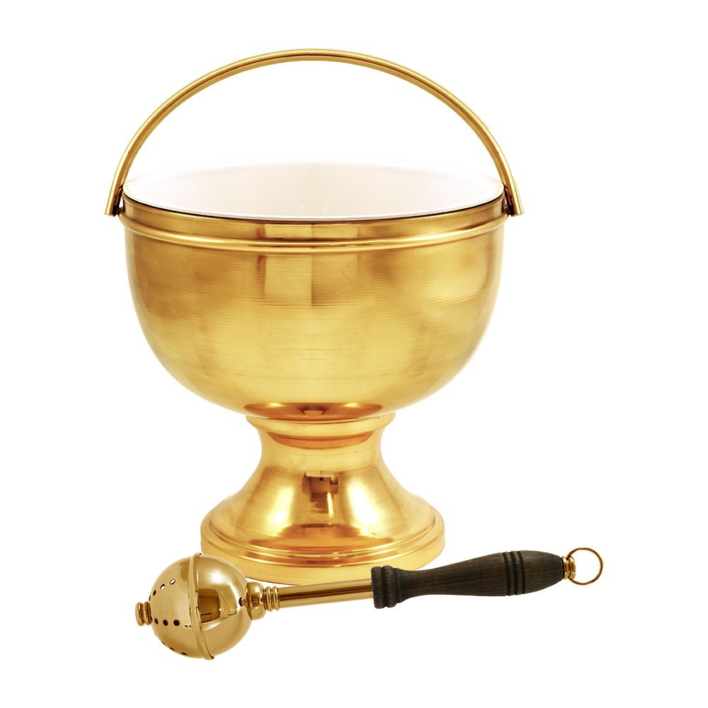 Set liturgico completo di secchiello e aspersorio per acqua benedetta.