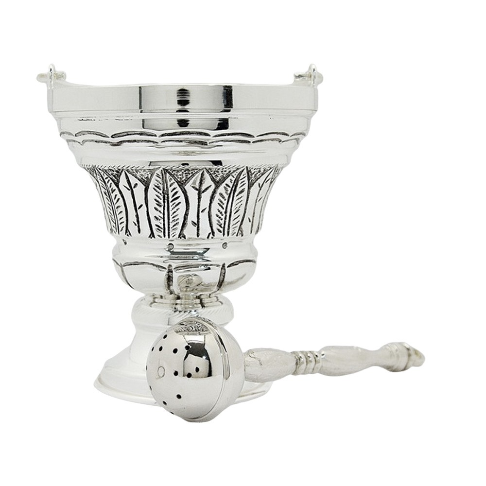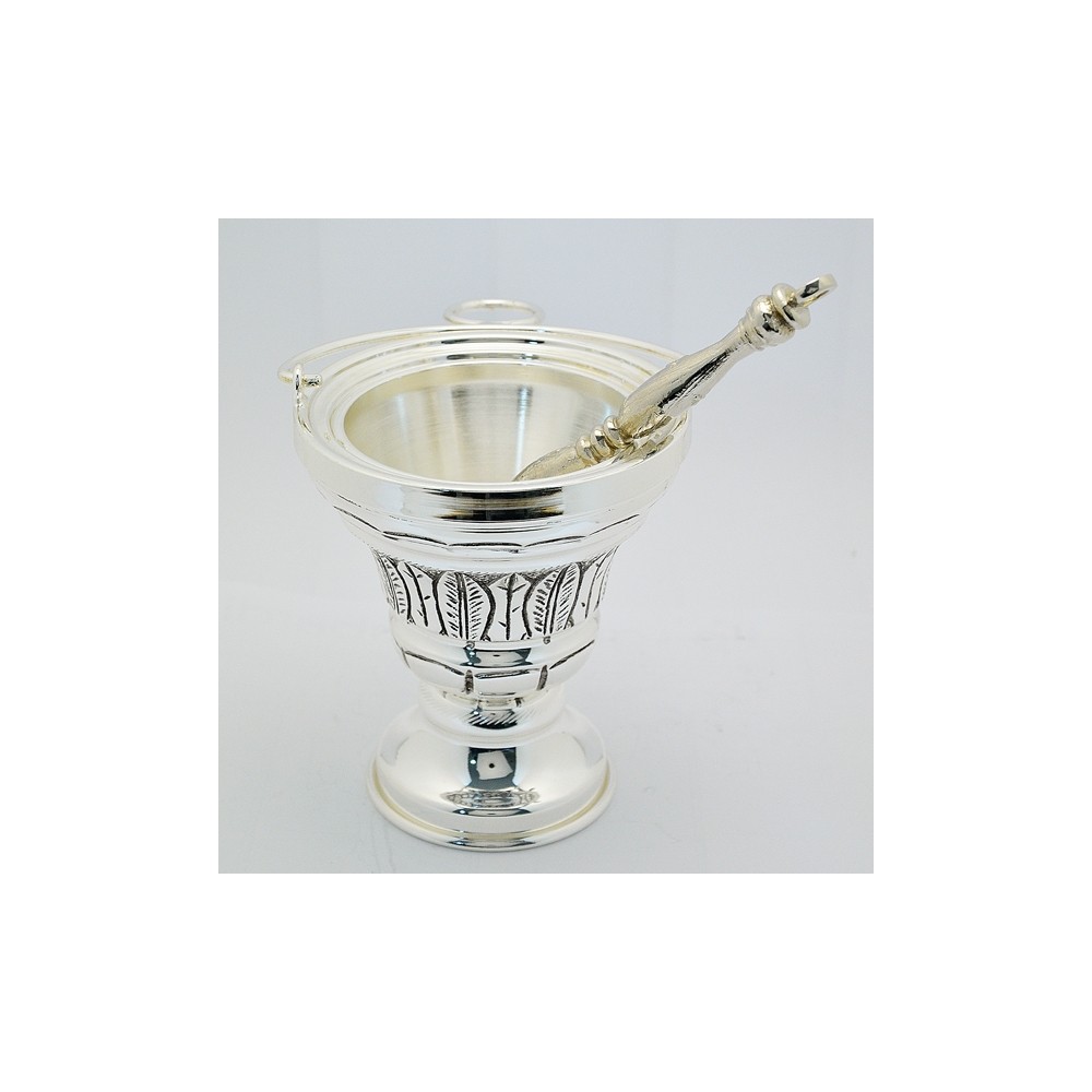 Secchiello in ottone argentato cesellato a mano da maestri cesellatori. Completo di aspersorio. Abbinabile a turibolo .