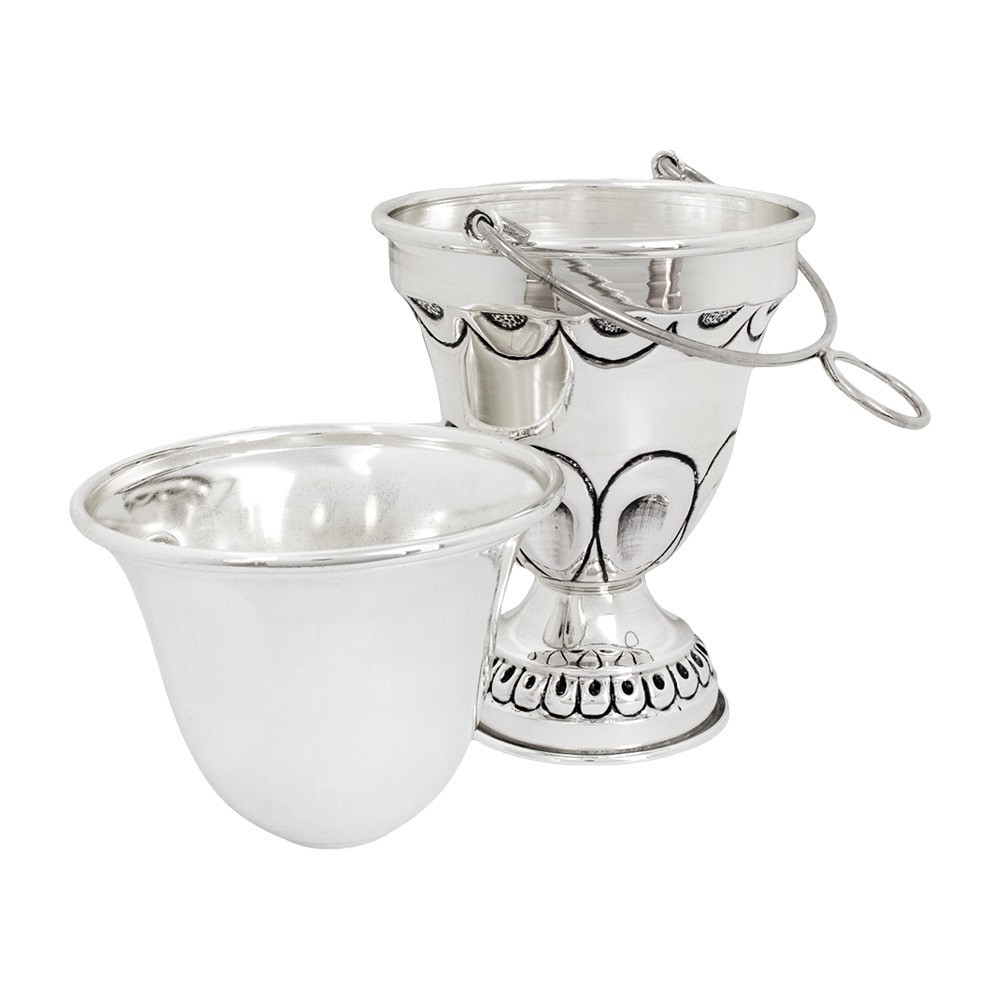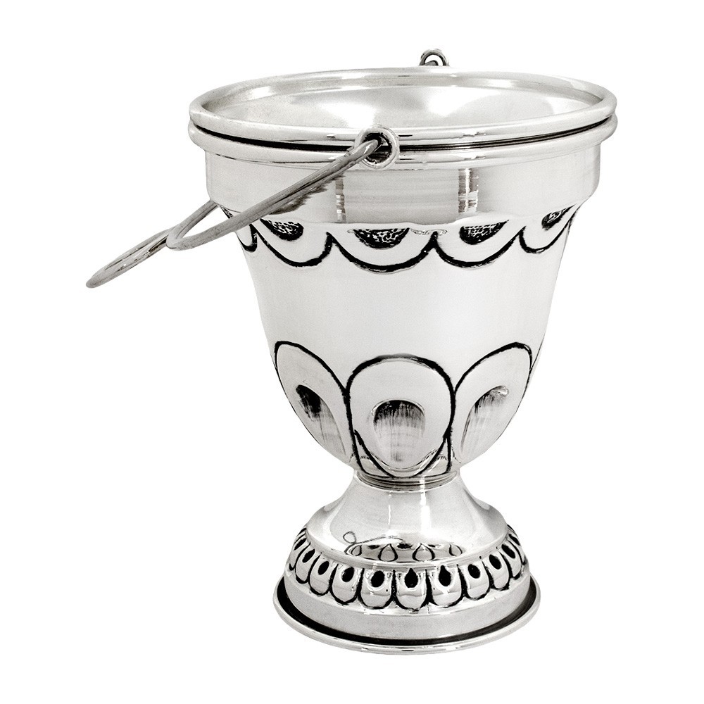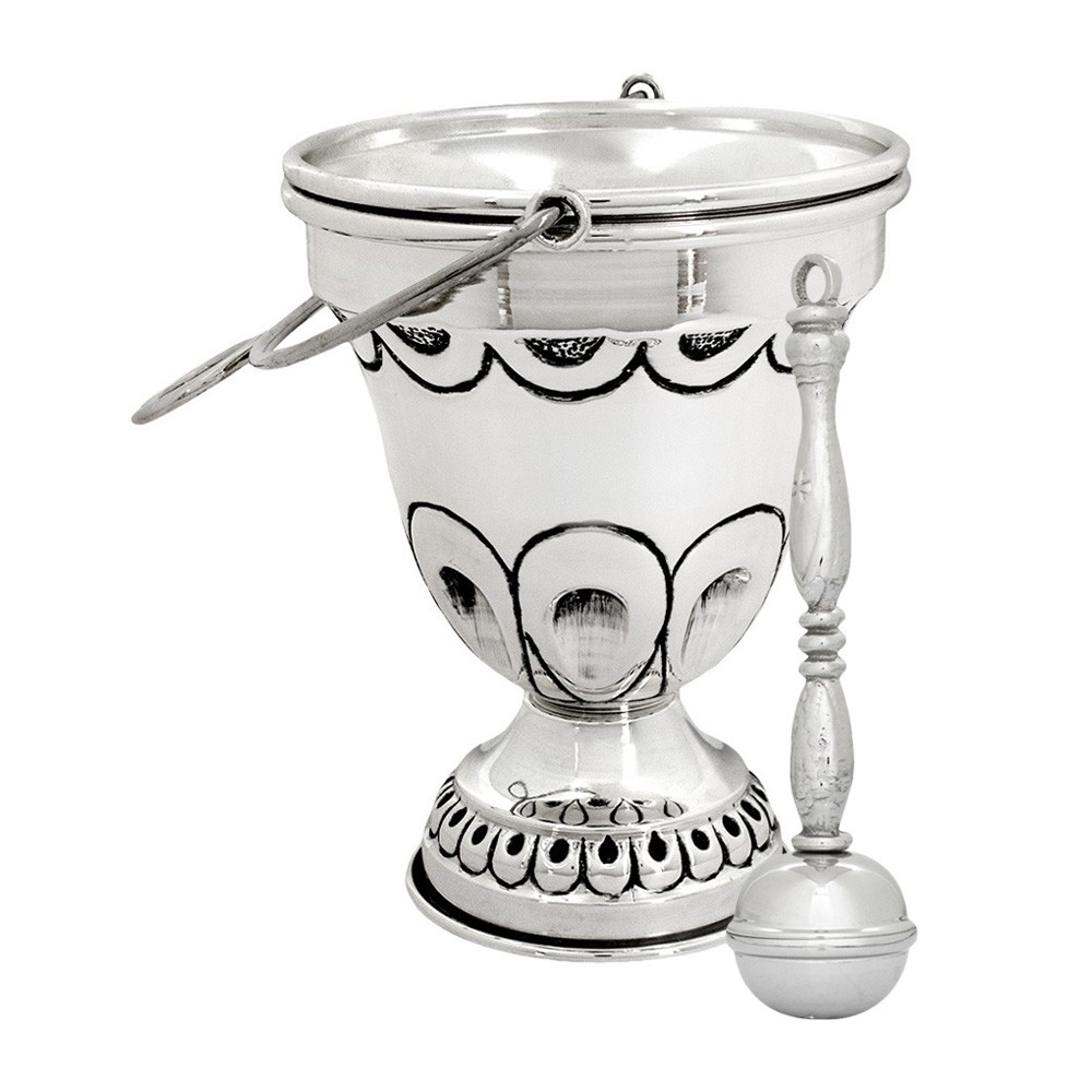 Questo secchiello per acqua santa è realizzato interamente in ottono con finitura argentata e cesellato a mano.