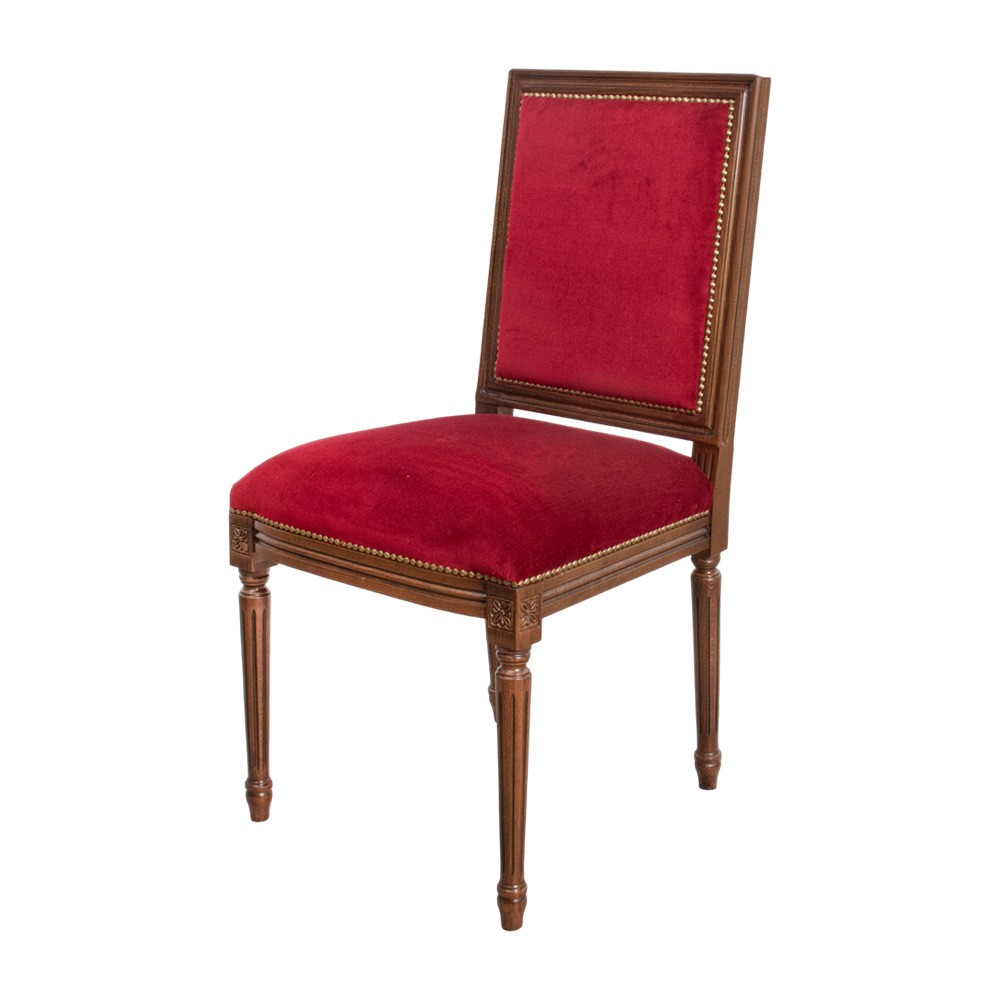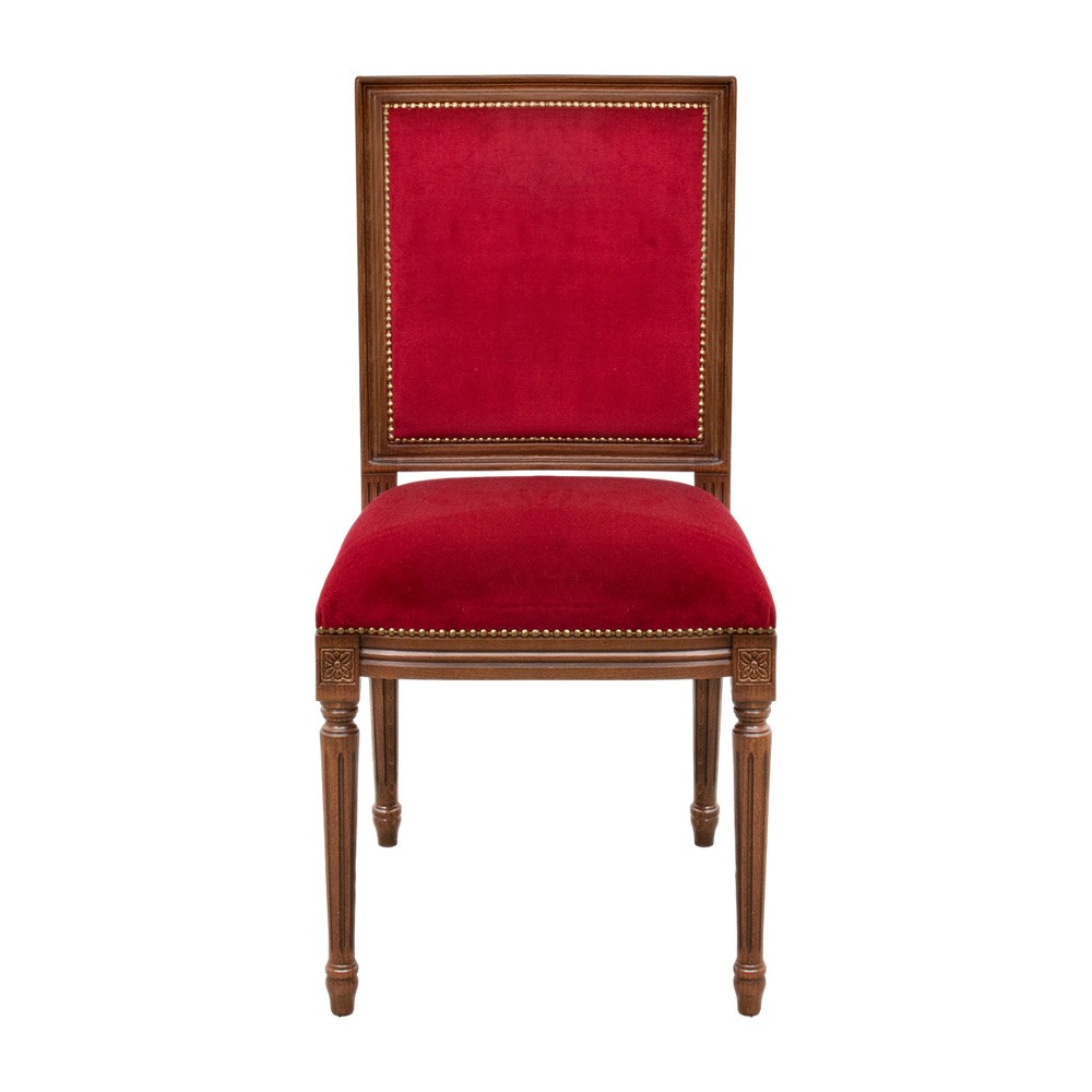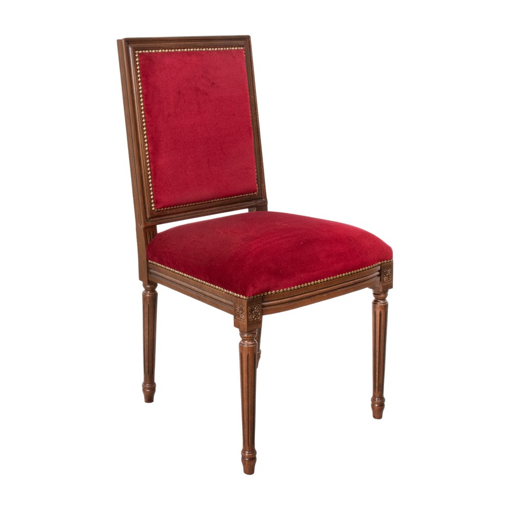 Realizzata con telaio in legno noce, seduta e schienale in velluto rosso.