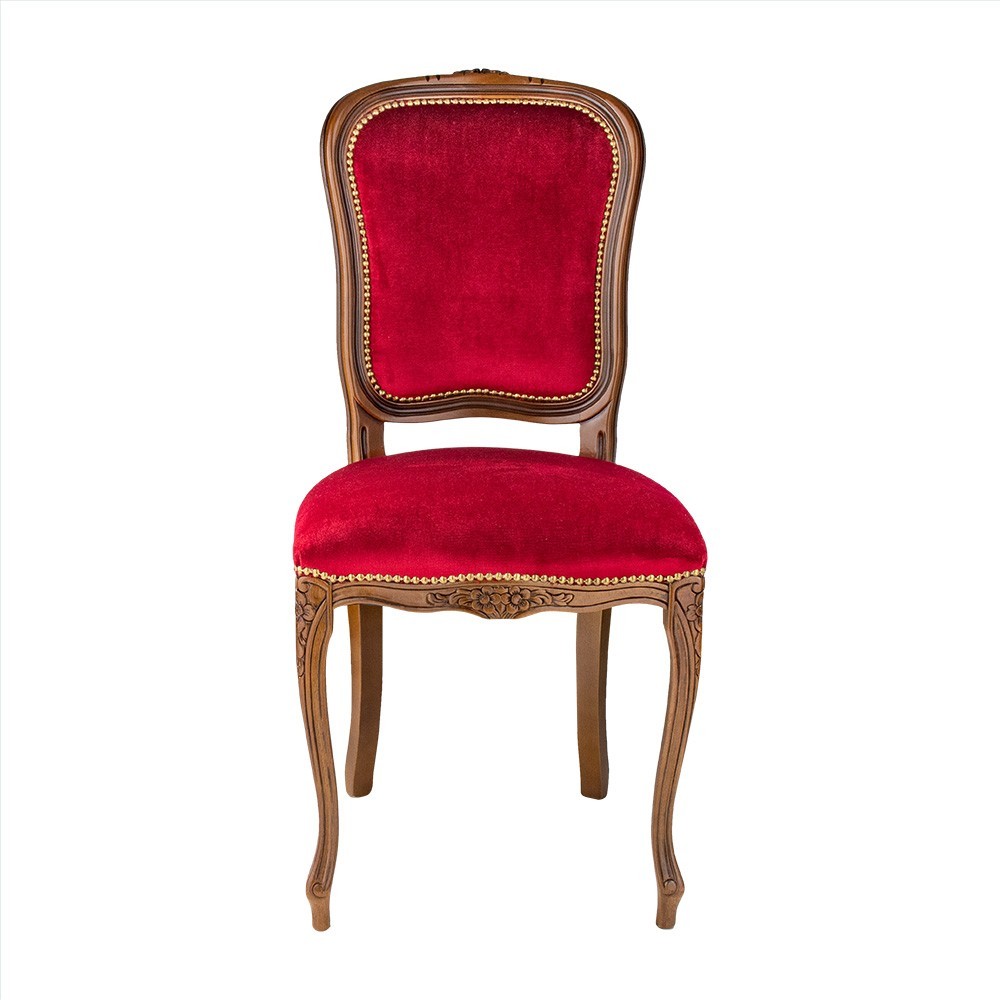 Sedia in stile barocco in legno e velluto rosso.