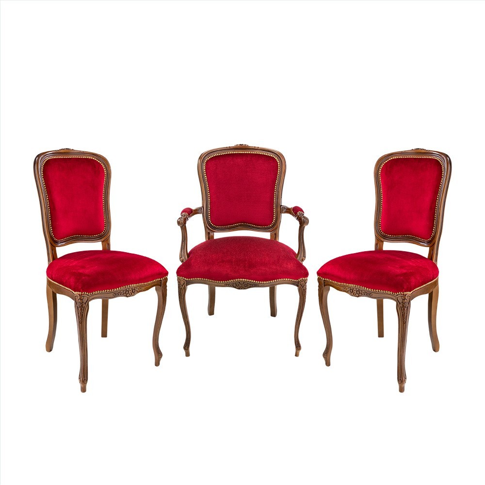 La poltrona e le sedie sono prodotti in legno color noce con lavorazione ad intagli. Le sedute e lo schienale sono rivestiti in tessuto in velluto rosso.