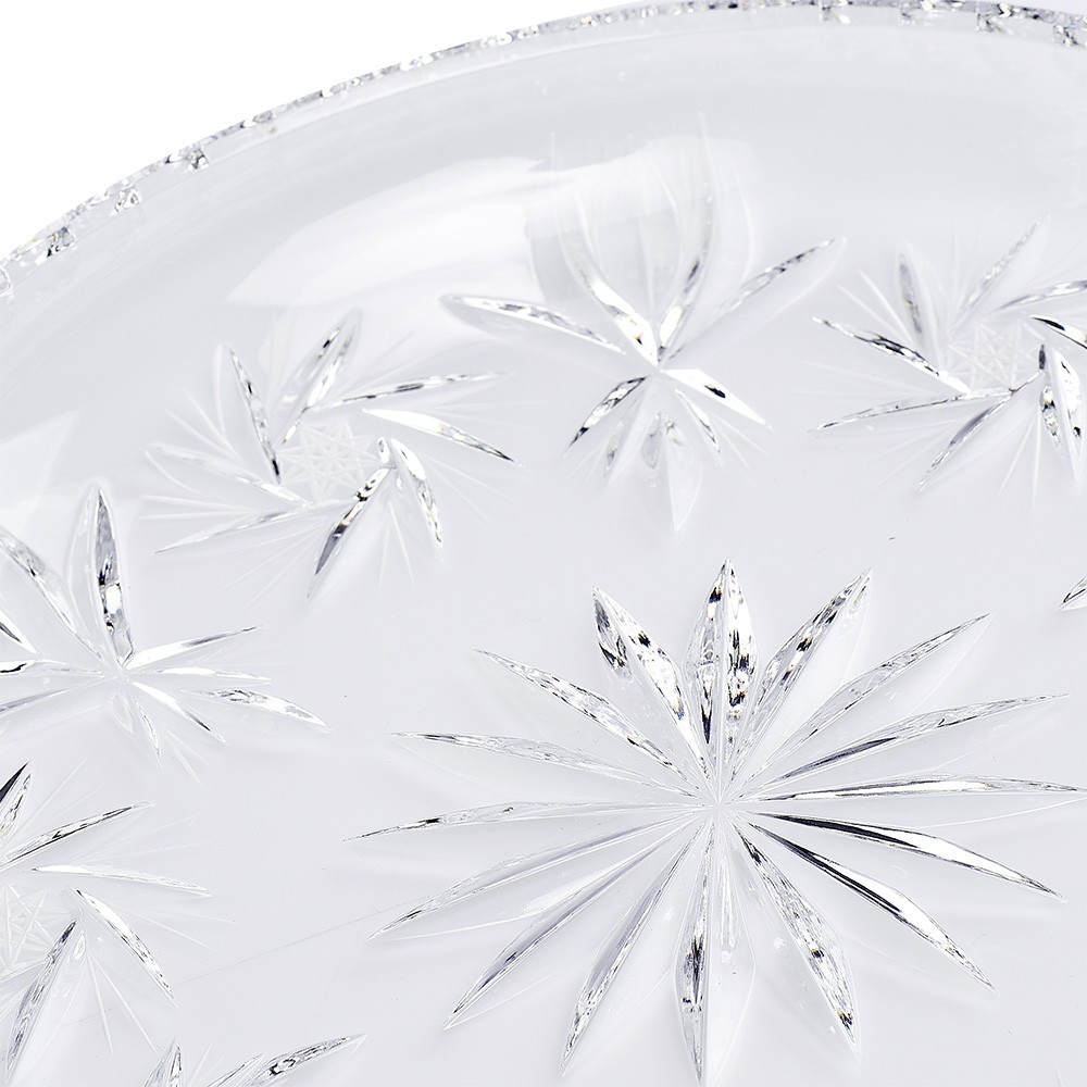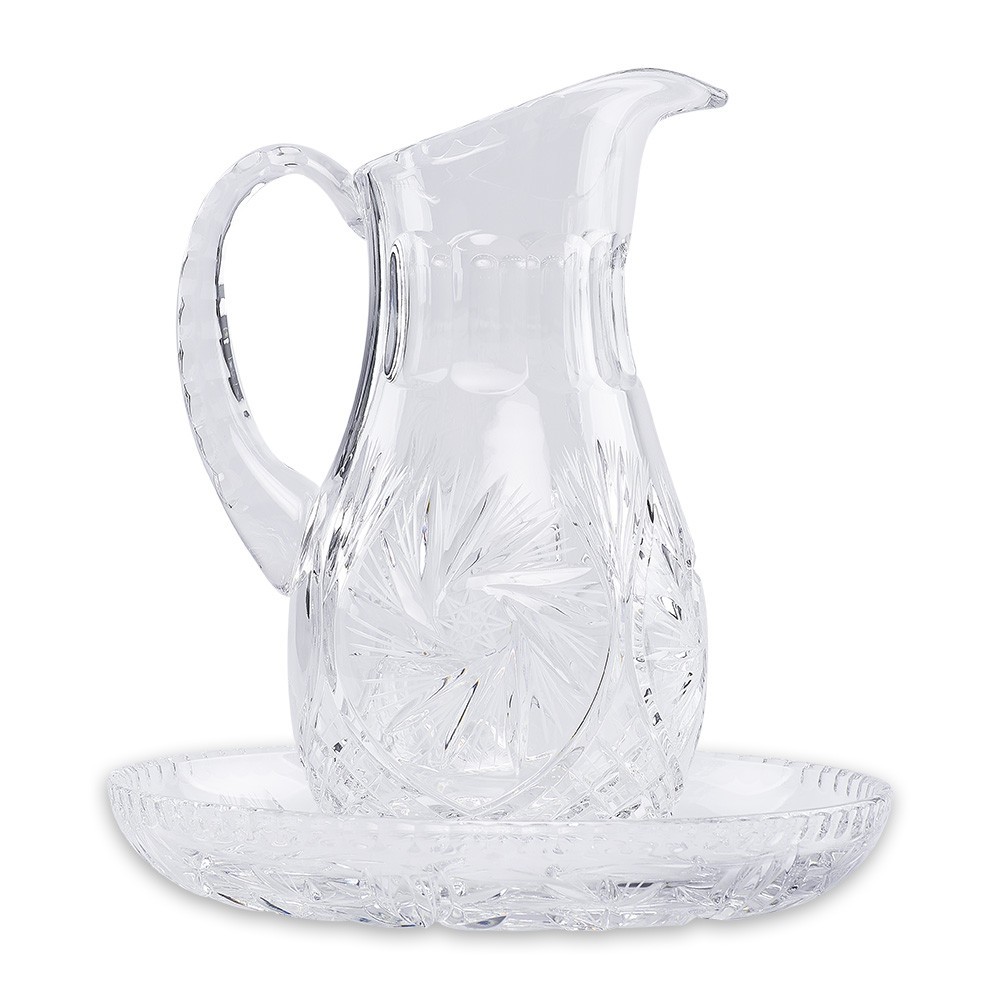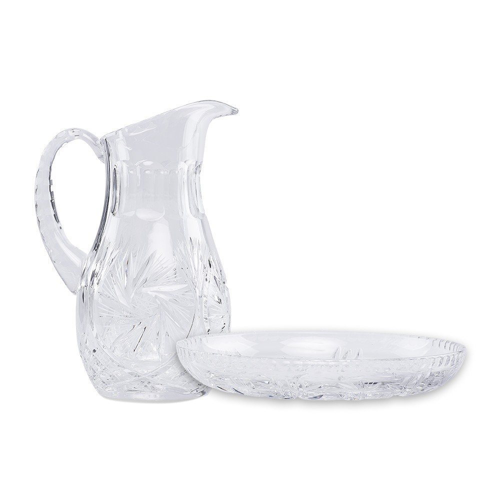 Set completo composto da brocca e piattino in cristallo. L'altezza della brocca è 26 cm, il diametro del vassoio è 26,5 cm.
