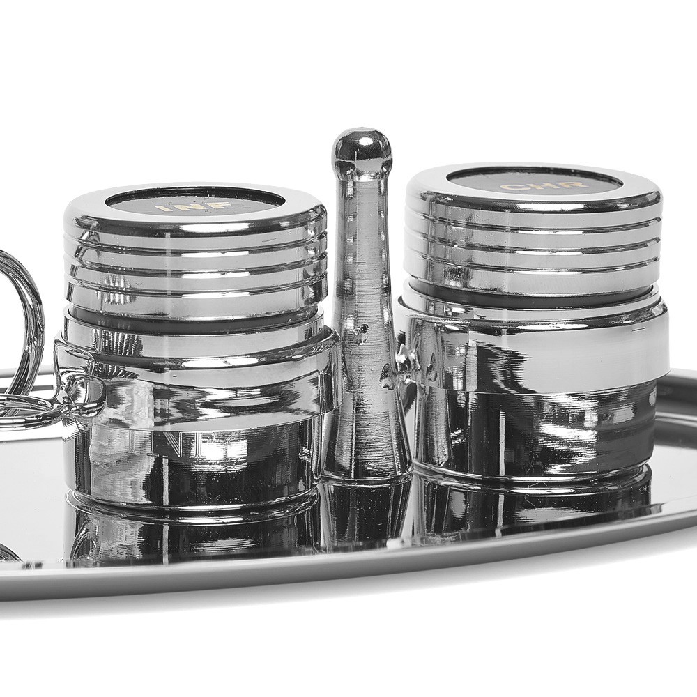 Set per il rito battesimale realizzato in ottone nichelato. Il set è comprensivo di vassoio, 2 vasetti di oli crisma e catecumeni, una piccola conchiglia e un tovagliolino.