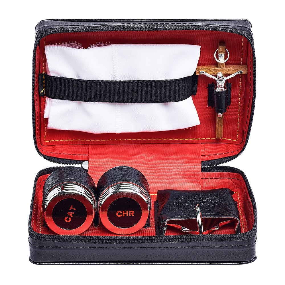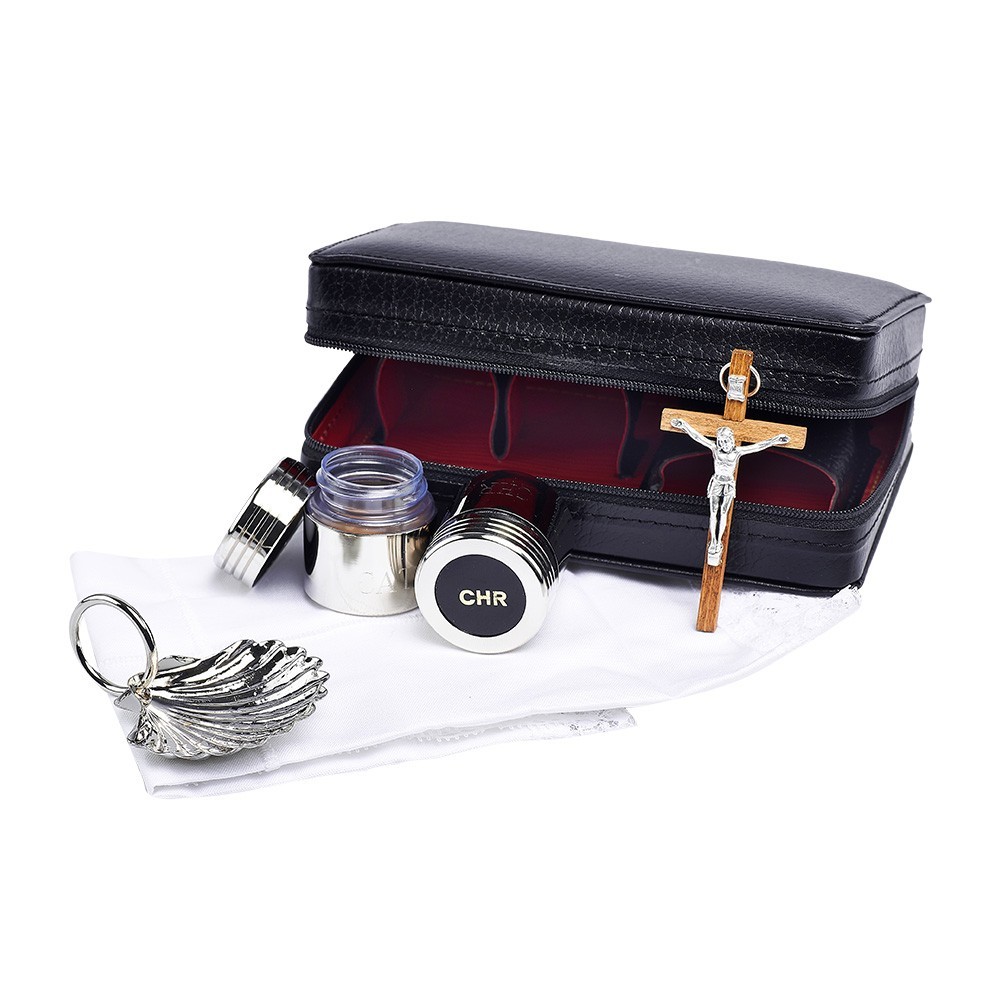 Set per il rito battesimale completo di astuccio. L'astuccio è di colore nero e internamente è in tessuto rosso, completo di chiusura a cerniera.