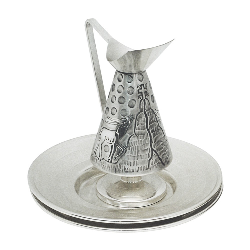 Set completo di brocca con piatti per la lavanda dei piedi. Il set è interamente in ottone argentato e riporta una decorazione cesellata con cervi che si dissetano alla fonte. Viene fornita con due piatti lavorati a godrone.