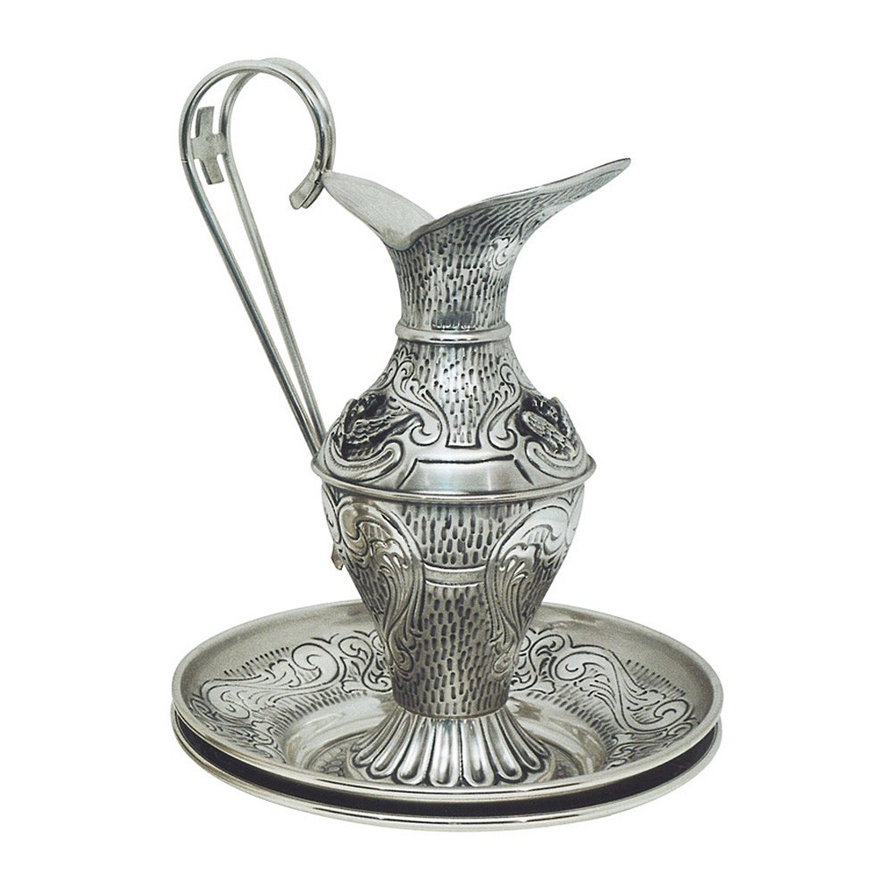 Set liturgico completo di brocca e due piatti coordinati. Il set è in ottone riccamente cesellato e ornato con fusioni di angeli sul fusto.