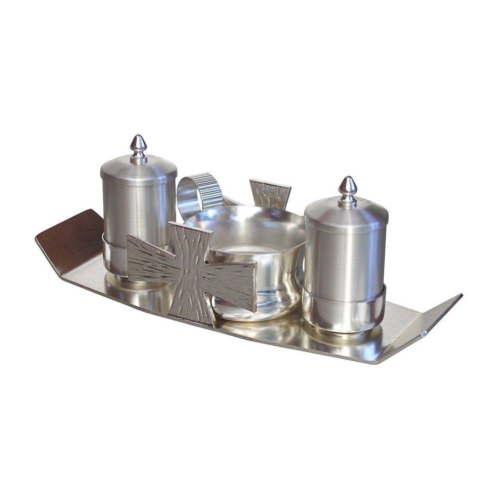 Questo servizio per battesimo è realizzato in ottone ed è arricchito con croci lavorate ai lati. E' completo di vasetti per oli sacri e brocchetta per acqua.