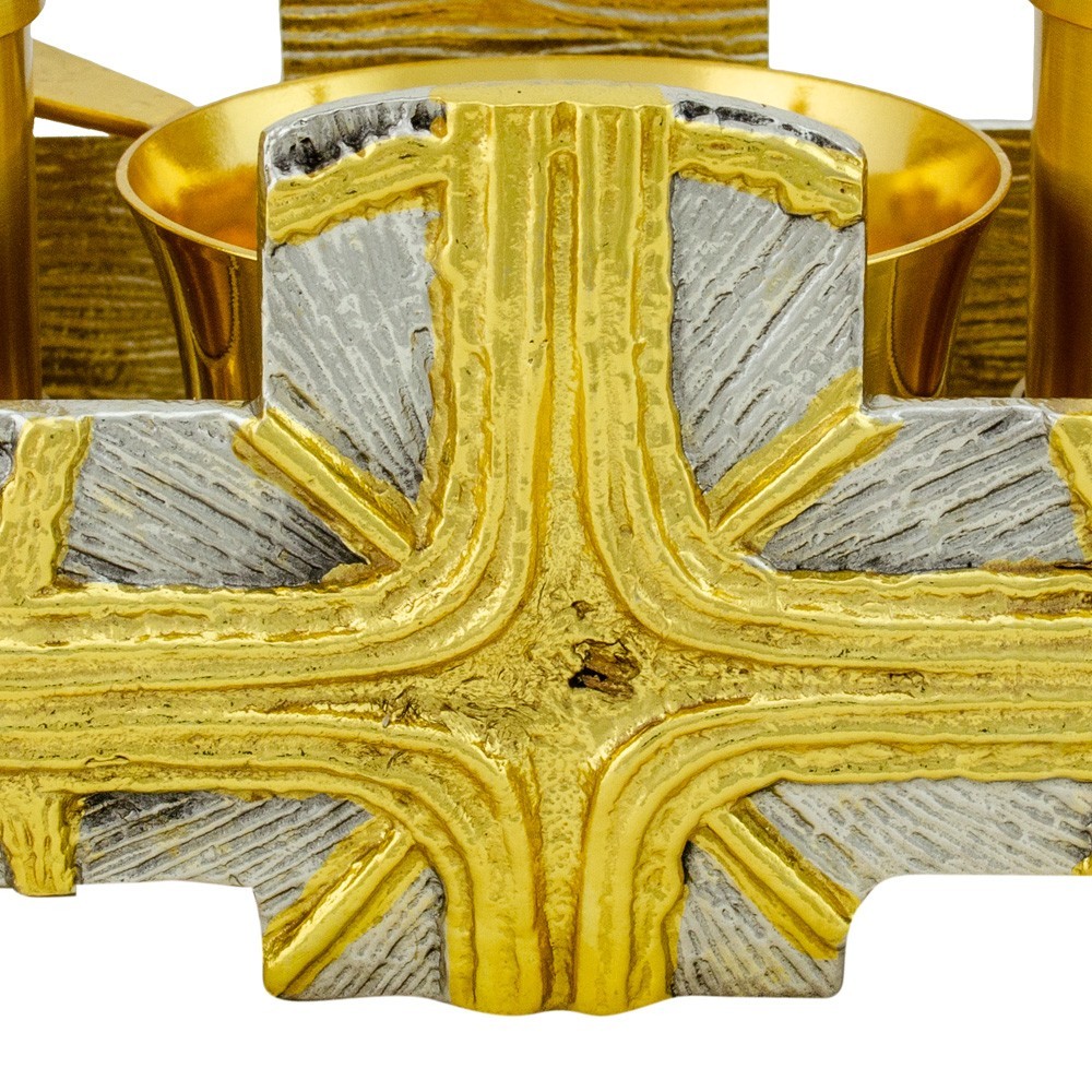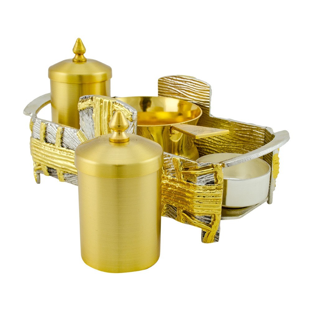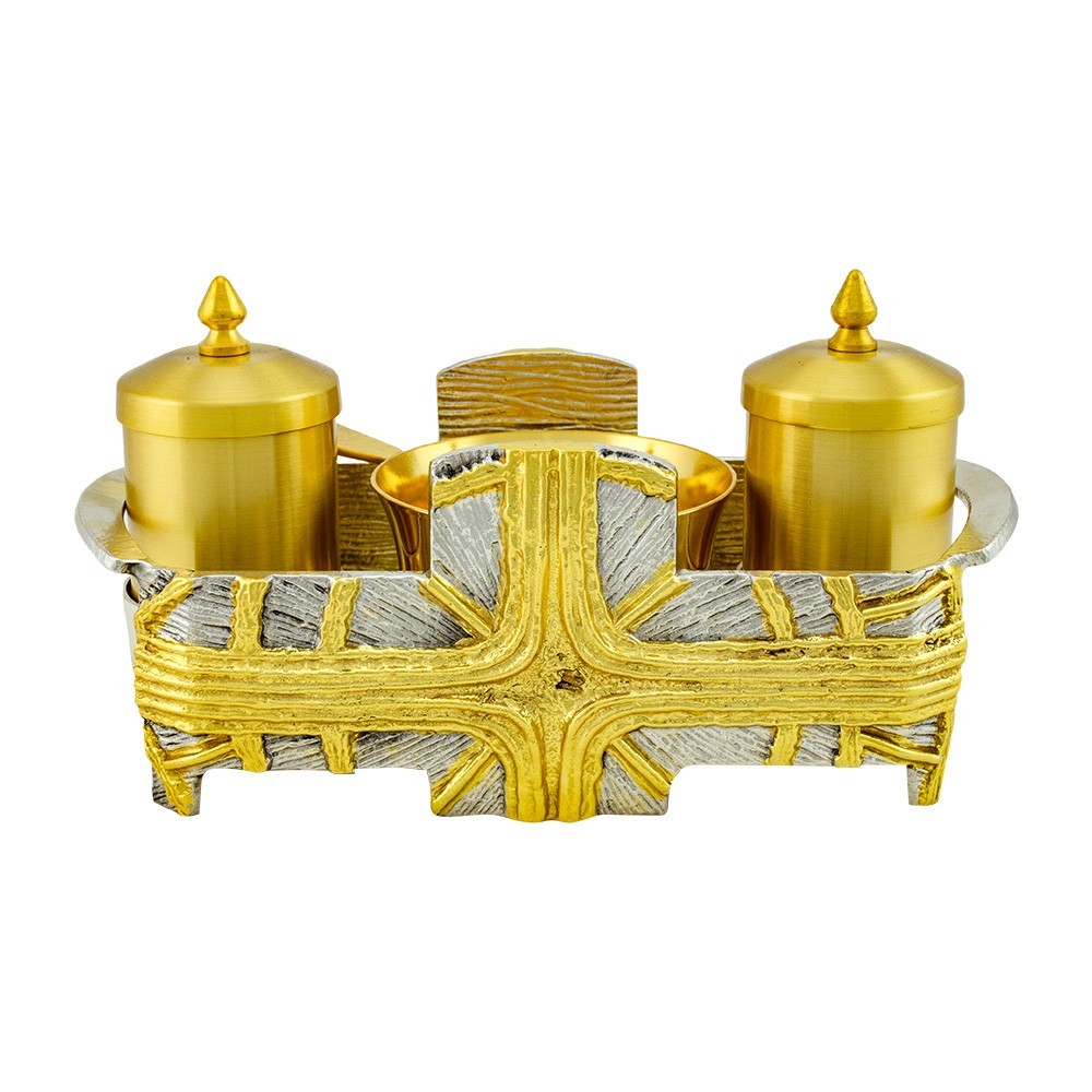 Servizio completo per il rito battesimale realizzato in ottone bicolore. Questo set per battesimo è decorato con una croce dorata e raggiata su uno sfondo argentato. Completo di vasetti per olii sacri e brocchetta per acqua.