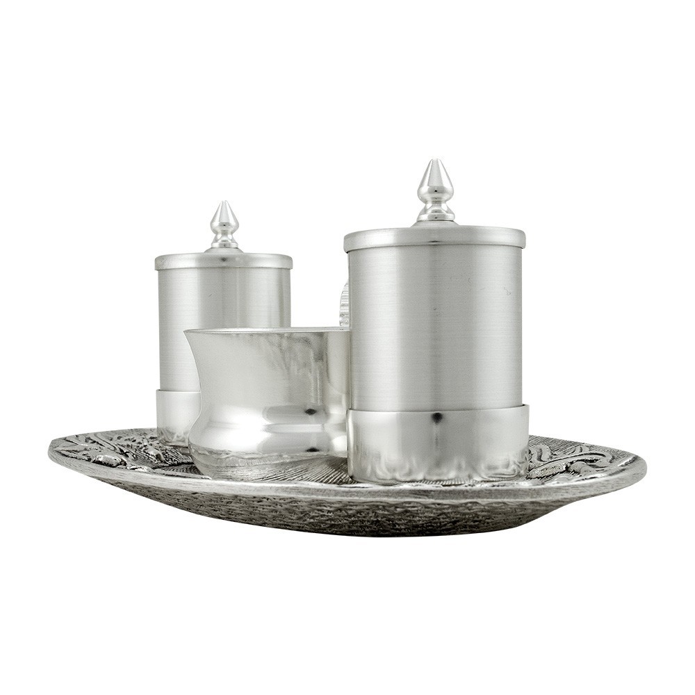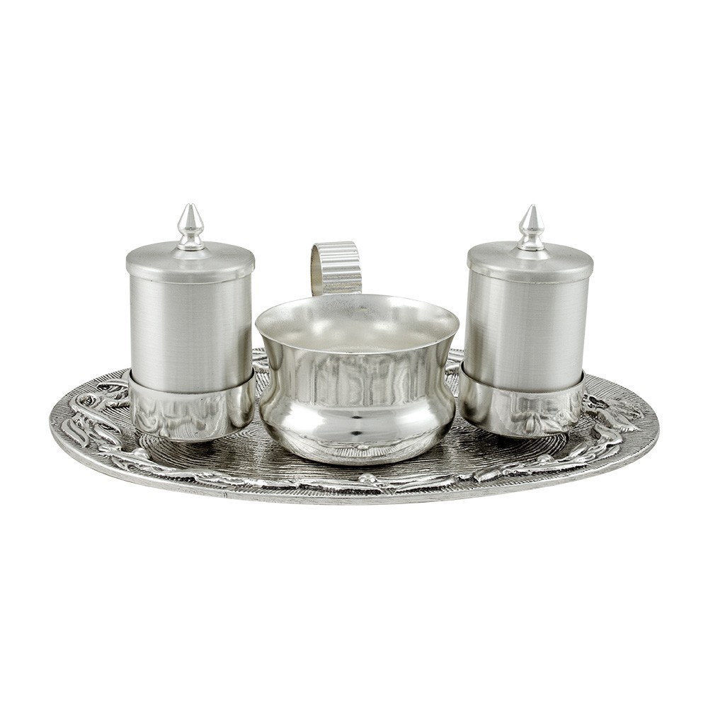 Completo per il rito battesimale realizzato in ottone con finitura argento. Decorato con lavorazioni di ulivo a rilievo sulla bordura. Il servizio battesimale comprende vaseti per oli sacri e brocchetta per acqua.