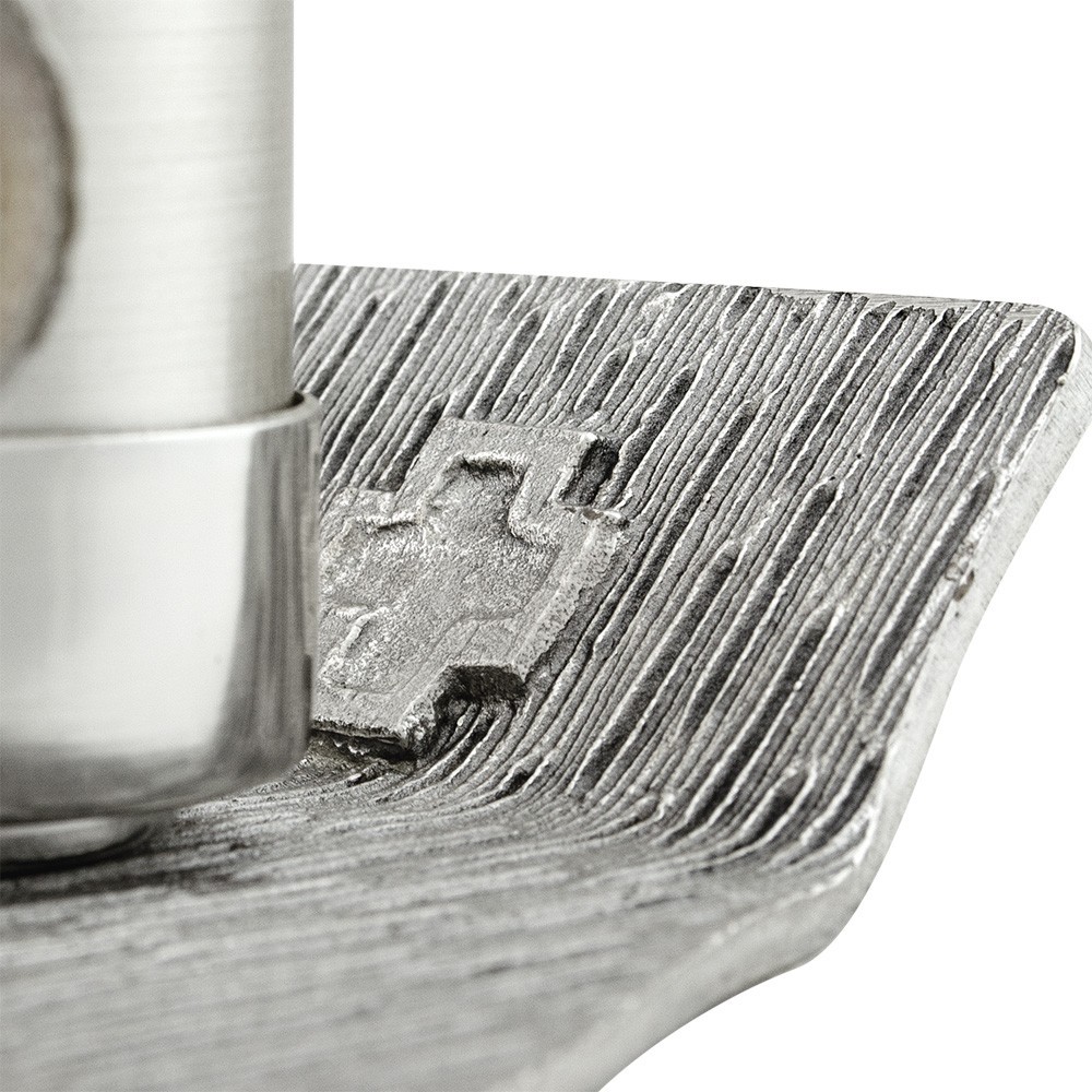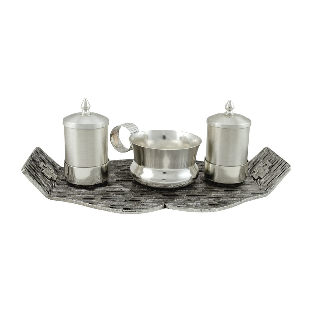 Questo servizio battesimale è completamente realizzato in ottone con finitura argento. Viene fornito completo di due vasetti oli sacri e brocchetta per acqua.