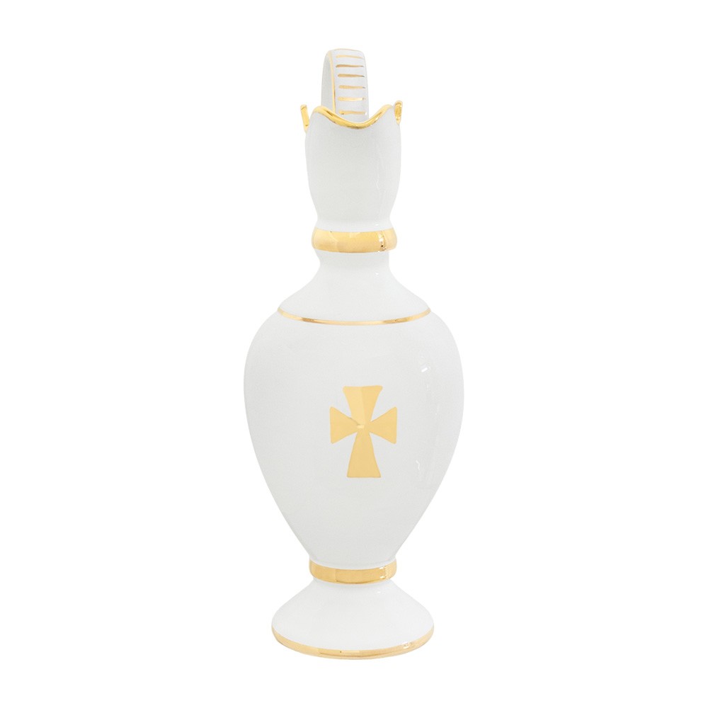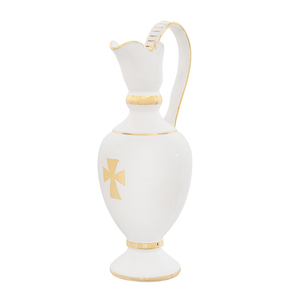 Brocca liturgica in ceramica decorata finemente a mano color oro e bianco con croce.