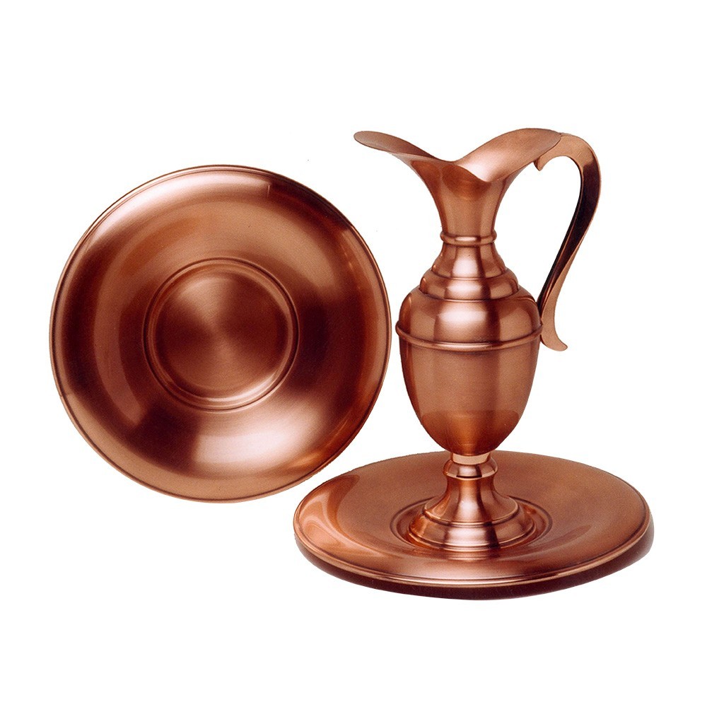 Set brocca con due piatti per lavanda dei piedi in rame.