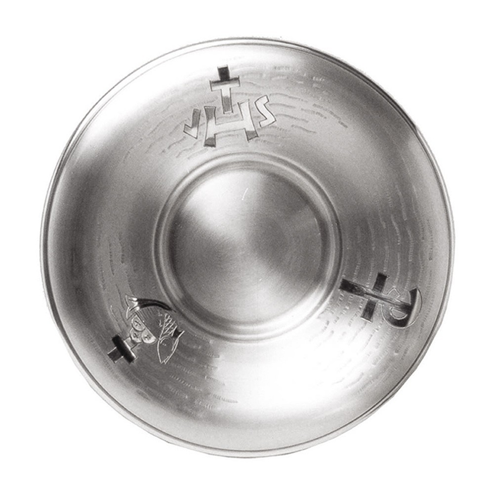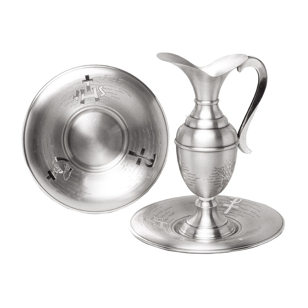 Set composto da una brocca e due piatti per lavanda dei piedi. Realizzati in ottone argento, cesellato a mano. Produzione 100% italiana.