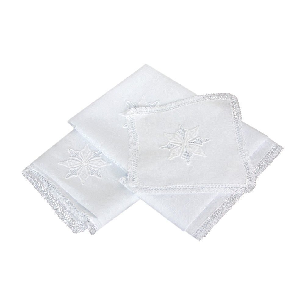 Si compone di quattro pezzi: (corporale, purificatoio, manutergio, palla copricalice).