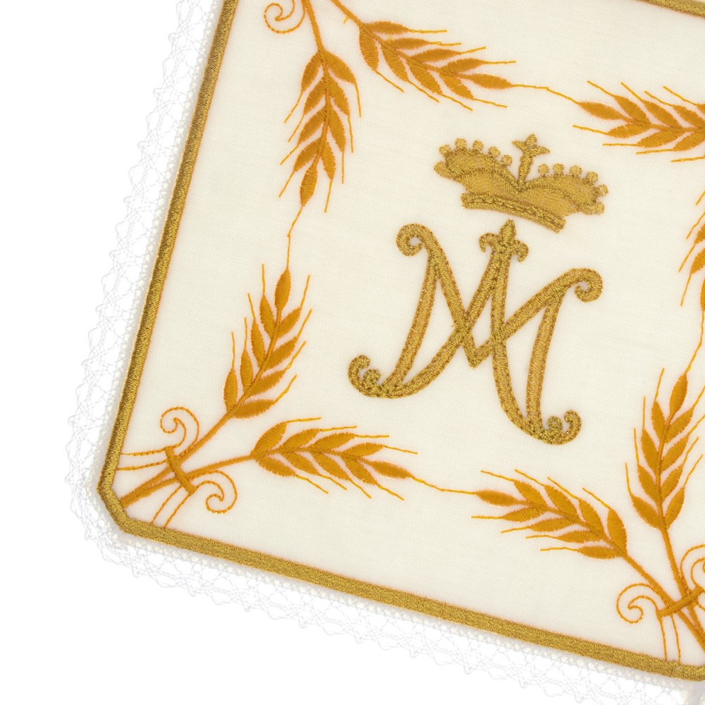Palla copricalice bianca con ricamo Mariano e spighe.