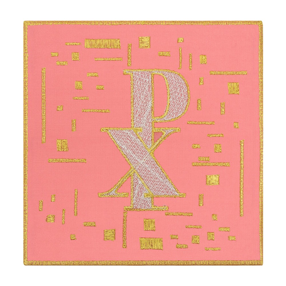 Palla per calice liturgico ricamata su tessuto in poliestere color rosa.