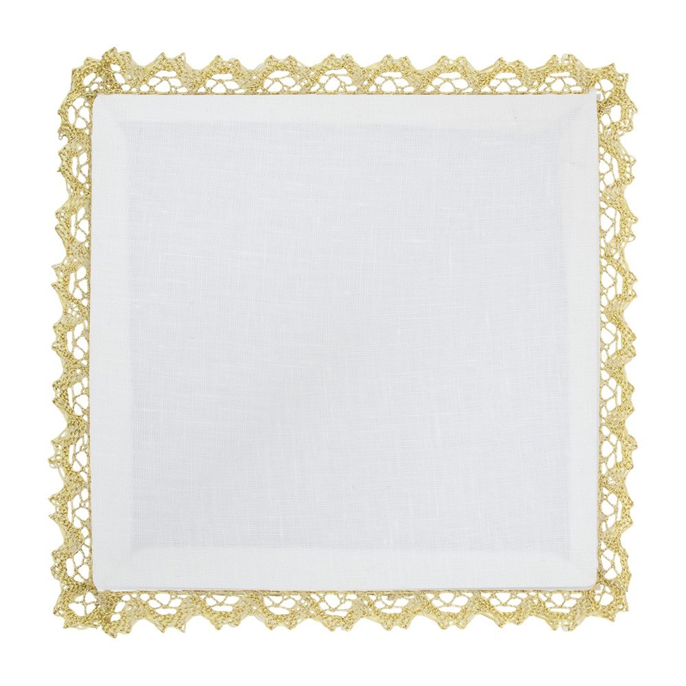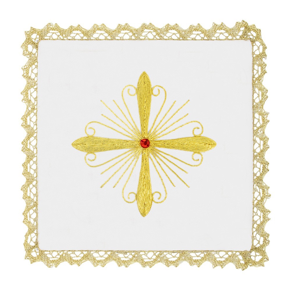 Il grazioso ricamo rappresenta una croce con pietra rossa centrale contornata da decori, eseguito accuratamente a MANO seguendo le antiche tecniche di lavorazione artigianale ed è rifinita con bordo in pizzo dorato.