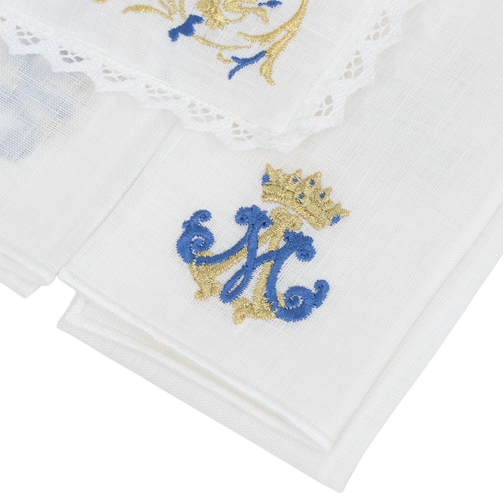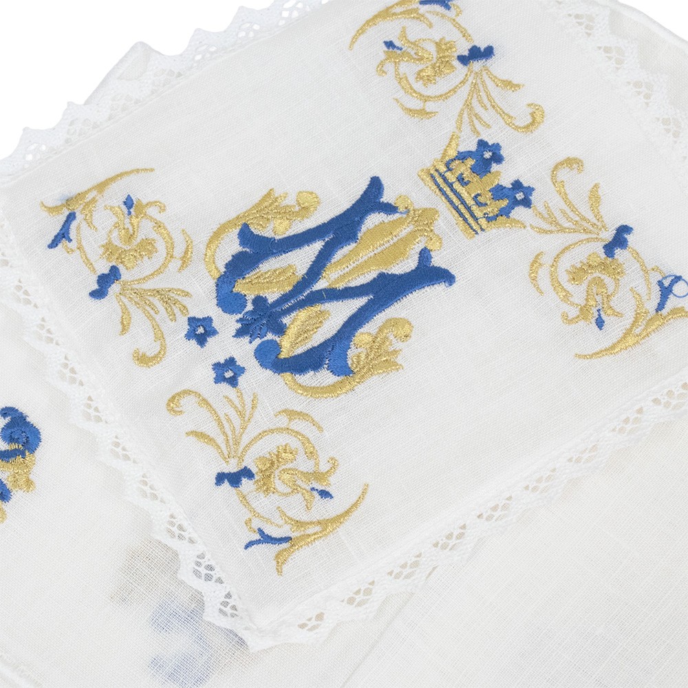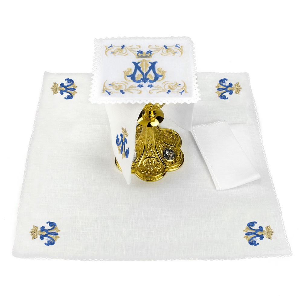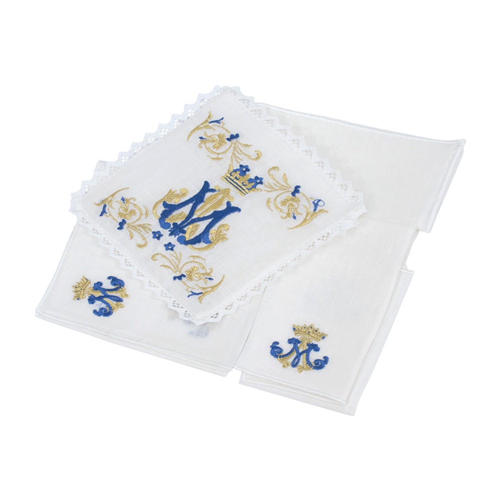 Servizio completo per la Messa con monogramma Mariano in filo dorato e blu.