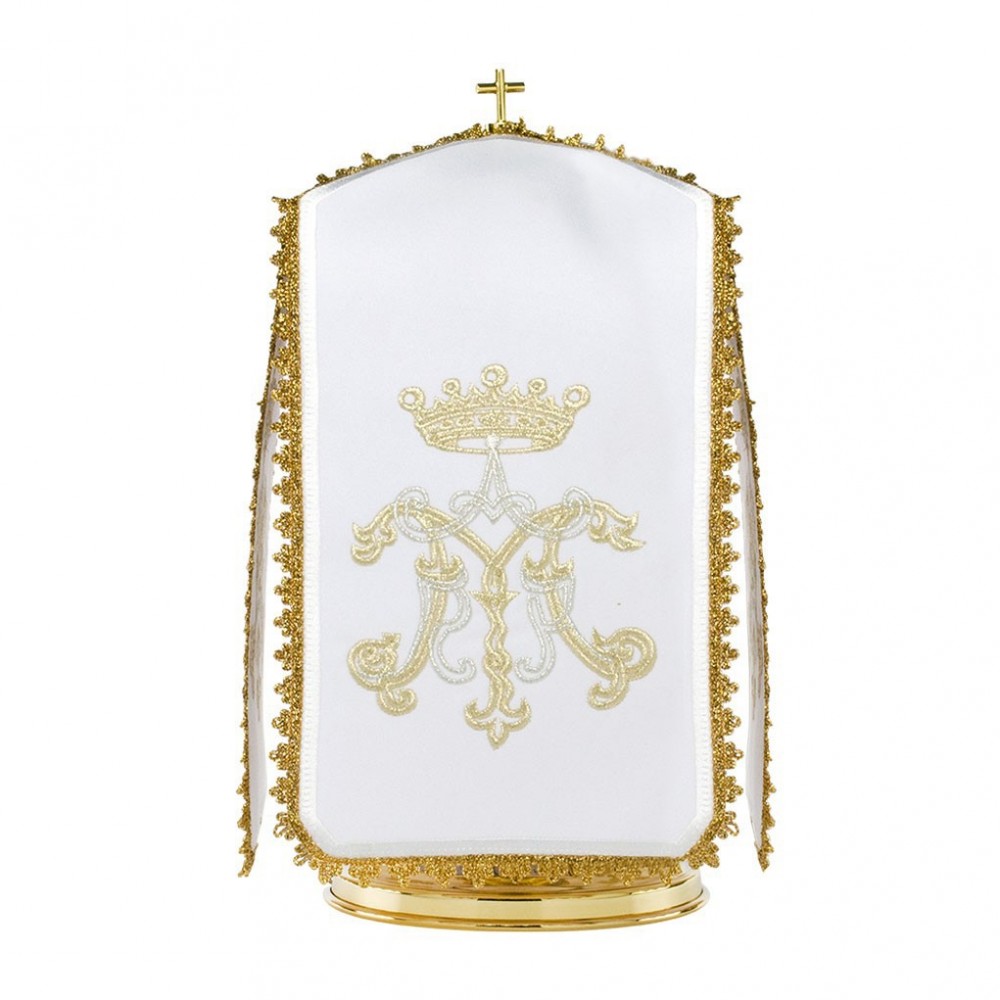 Copri Pisside in misto cotone con Ricamo Mariano. Ognuno dei 4 lati è ricamato in filo oro e argento ed ha un agremano dorato lungo i bordi.