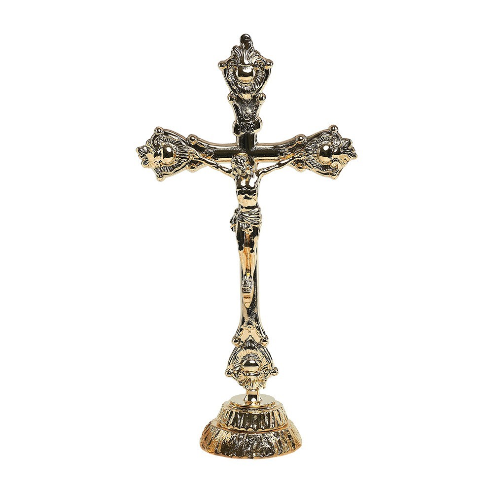 Croce da mensa in ottone con fusione oro. La croce è alta 37 cm. Articolo di buona qualità, produzione 100% italiana.
