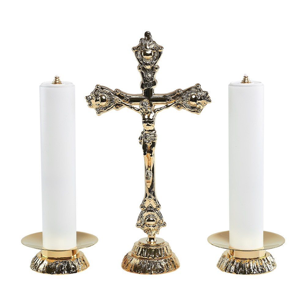 Set da altare completo composto da 3 pezzi. Completo di croce da altare con due candelieri abbinati in ottone con fusione oro. La coppia di candelieri è completa di finte candele e cartucce. Prodotto interamente lavorato e realizzato da un'azienda italiana, garantendo materiali di ottima qualità.
